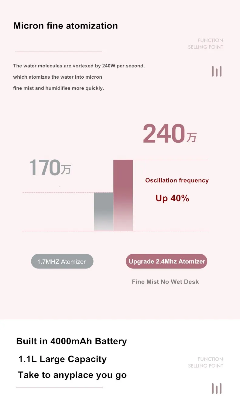 Water molecules undergo 2.4 million high-frequency oscillations per second, atomizing the water into micron mist, and accelerating