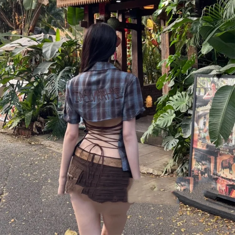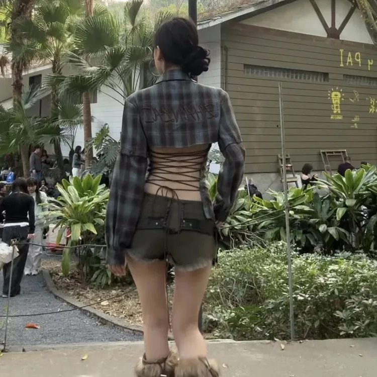 American Hot Girl Backless Lace Up Plaid Shirt Women's Spring And Summer New Slim Fit