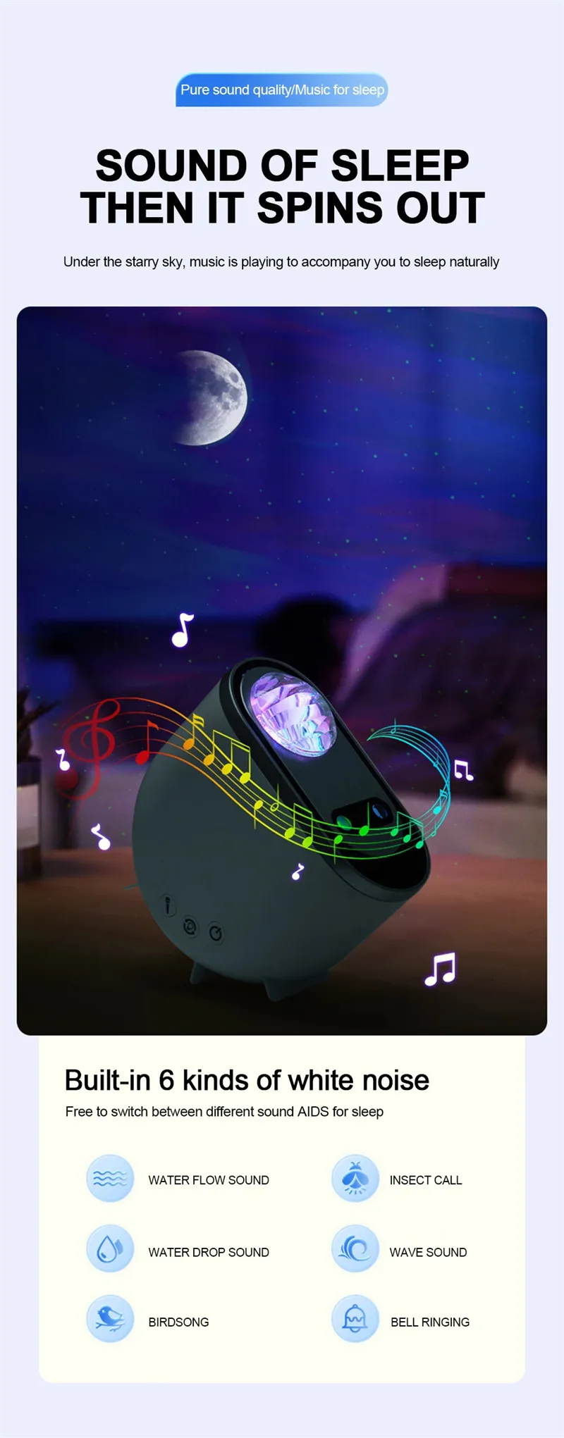 This projector simulates the stunning effect of the northern lights, casting soothing waves of color that fill the room. The aurora effect brings a calming, magical ambiance that can help reduce stress and promote relaxation. Perfect for creating a dream-like environment in your bedroom, living room, or meditation space, the Aurora Borealis effect is a beautiful addition to any room.