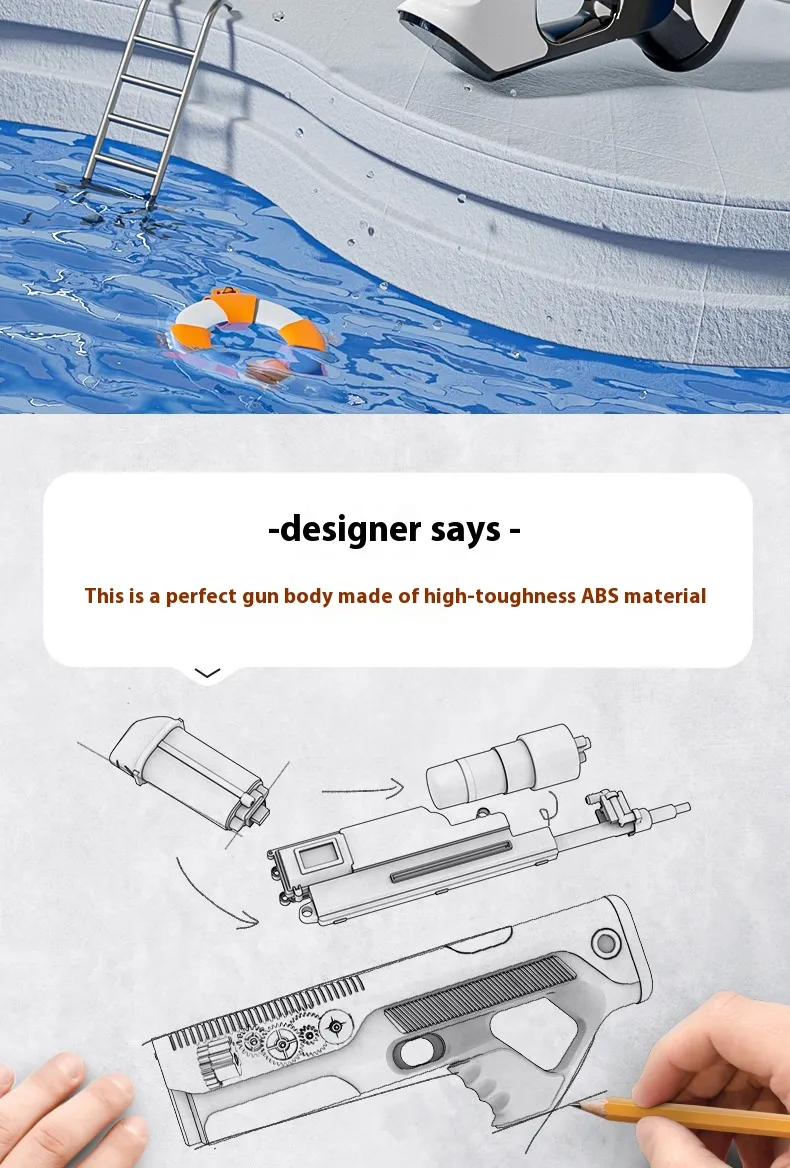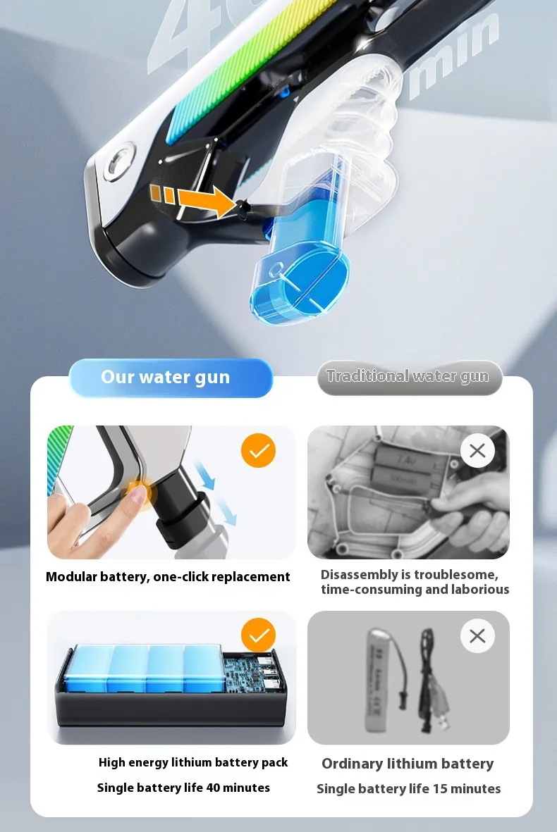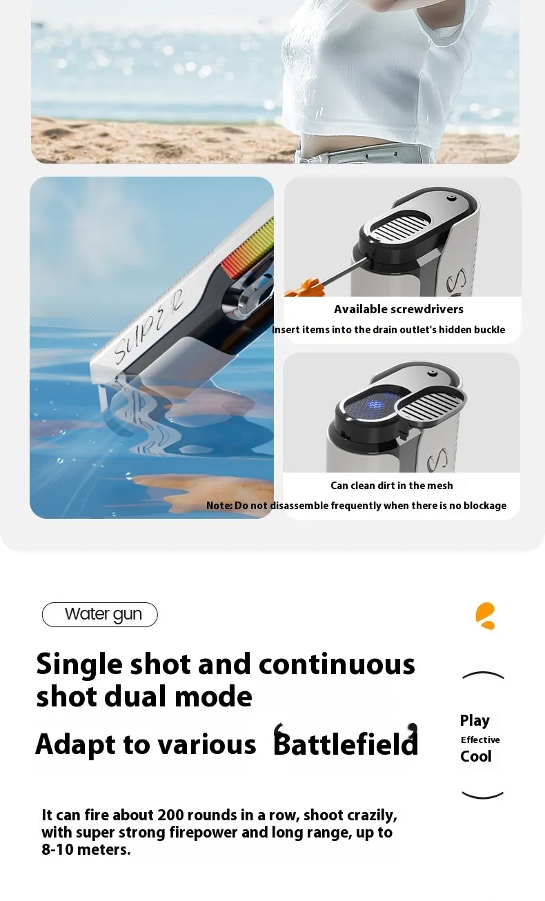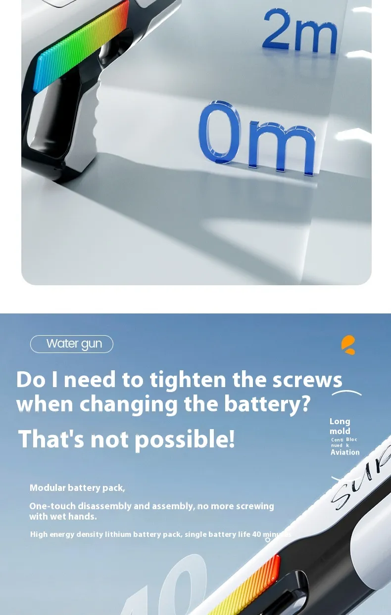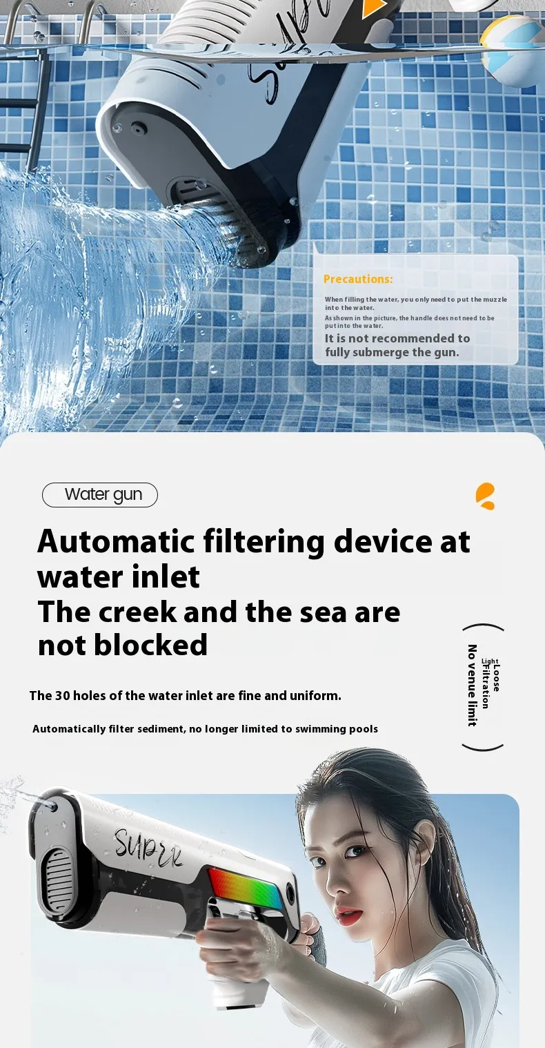 The automatic feeding system ensures that water is quickly and efficiently drawn into the gun, eliminating the need for frequent refilling. Simply submerge the gun's intake in a water source, and it will automatically recharge for continuous play. This feature makes the toy ideal for use in pools, backyards, beaches, or any outdoor water activity.