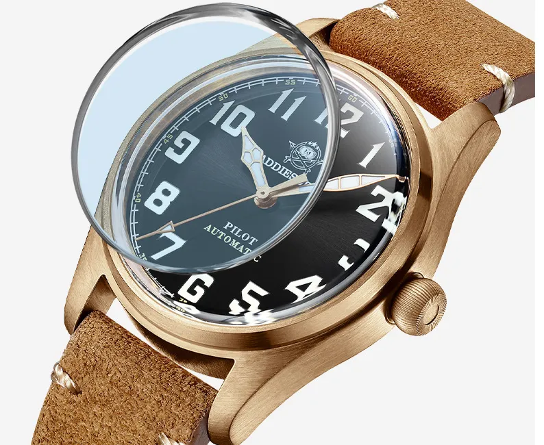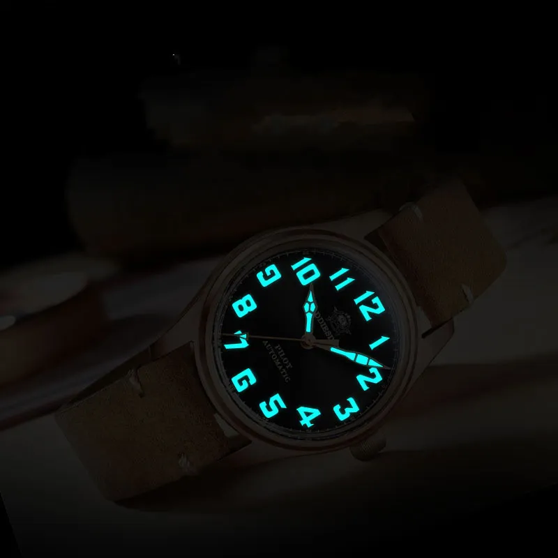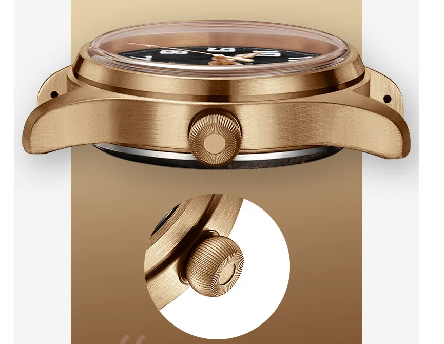 The bronze case gives the watch a distinctive and rugged aesthetic that matures over time. The natural patina that forms on bronze makes each watch unique, adding a personalized touch that enhances its character. This feature appeals to those who appreciate vintage design and the natural aging process of their timepieces.