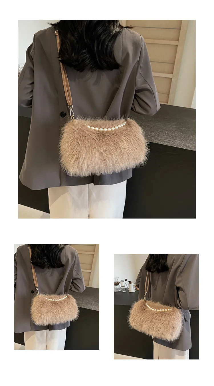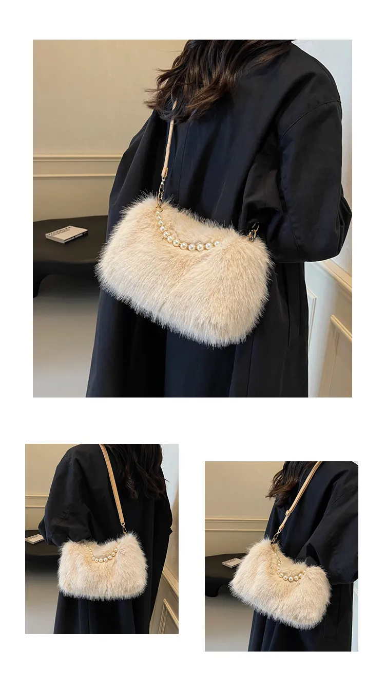comfort, and practicality. Featuring a chic pearl chain, plush material, and versatile design, this bag is perfect for adding a touch of