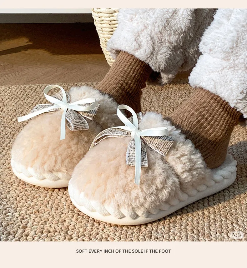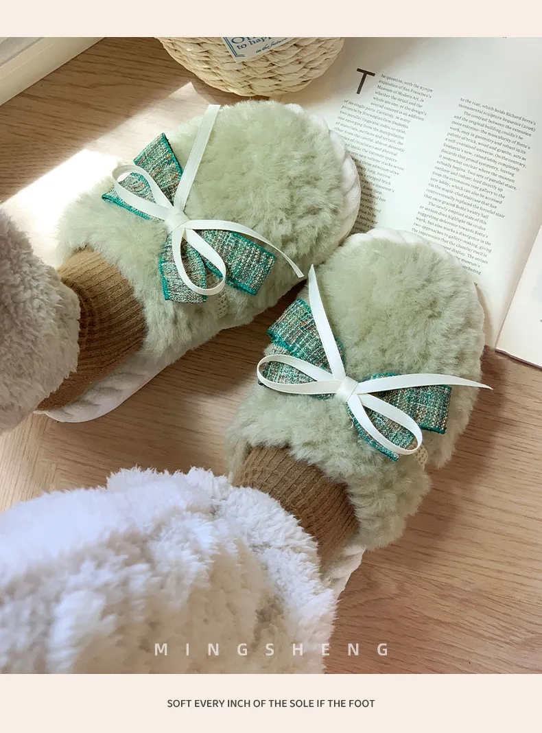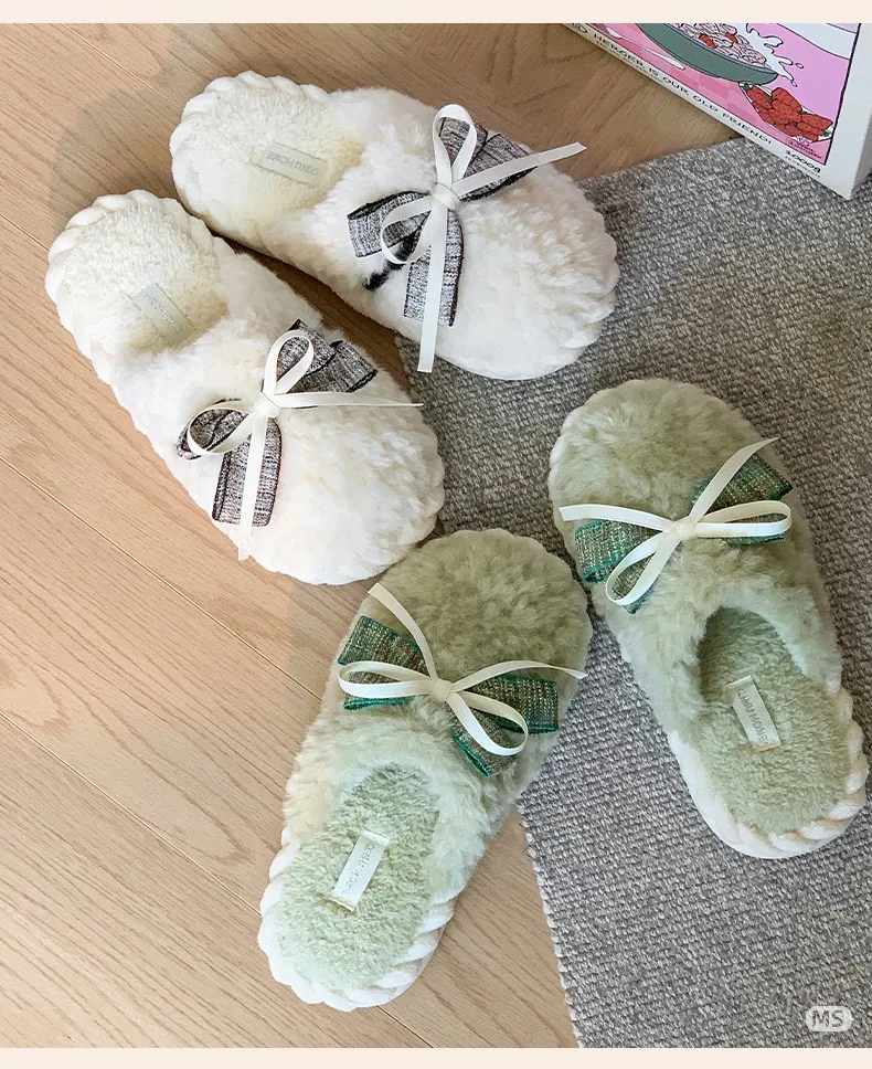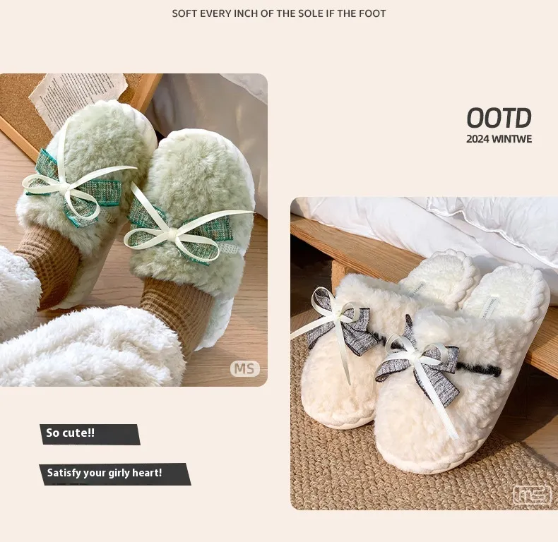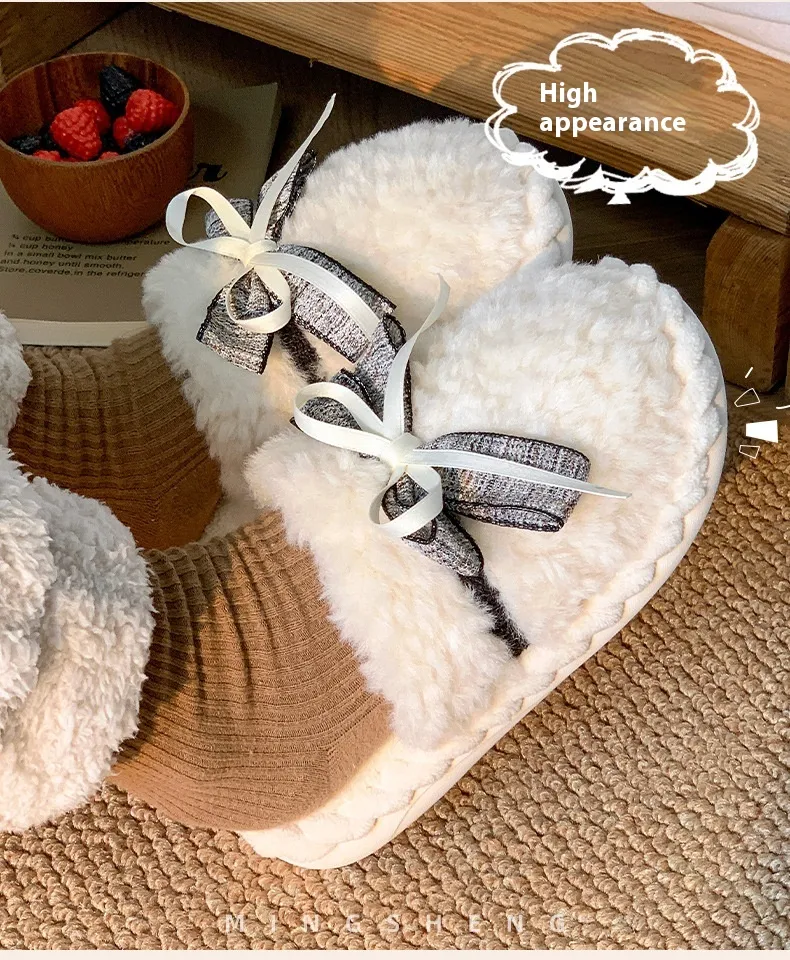 Autumn And Winter New Bow Tie Cotton Slippers Ladies Outside The Girl Heart Warm Plush Indoor Home Monthly Shoes Cotton Slippers