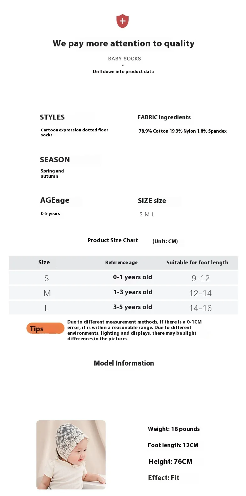 Thanks to the soft cotton material, these socks are gentle on your baby’s delicate skin. They provide all-day comfort, making them perfect for both casual use at home and outings during the spring and autumn months.