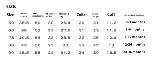 Suitable height: 59(0-3 months),66(3-6 months),73(6-12 months),80(12-24 months),90(24-36 months)
