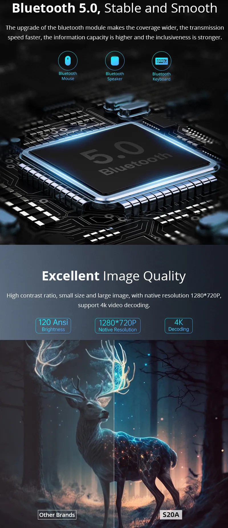 The projector's powerful built-in speakers provide clear and rich audio, creating a full cinematic experience without the need for additional speakers. The HY300’s auto-focus and keystone correction features ensure the image stays sharp and aligned, even when the projector is positioned at an angle. Its portable and lightweight design makes it easy to set up in any room, perfect for movie nights, gaming sessions, presentations, or simply enhancing your viewing experience at home.
