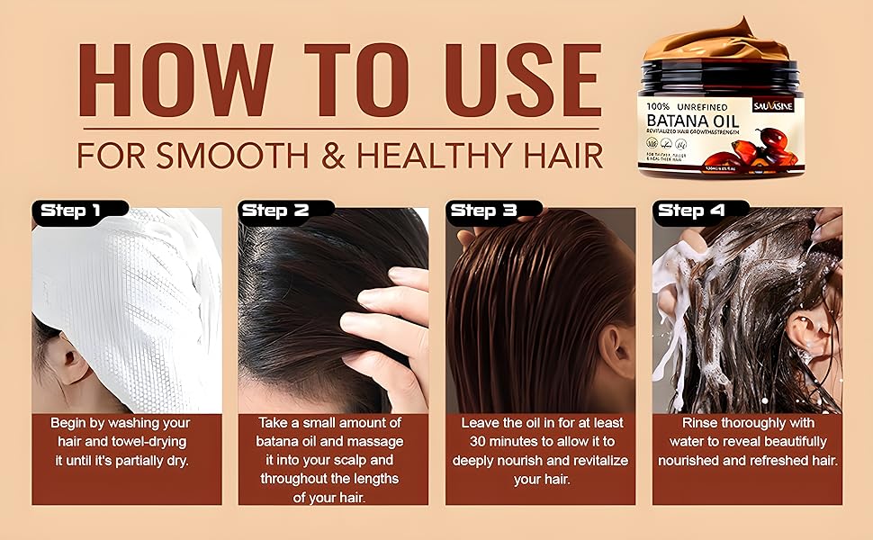 All-Natural and Chemical-Free Free from harmful chemicals, parabens, sulfates, and synthetic fragrances, Batana Natural Hair Growth Oil offers a safe, natural alternative for hair care. Ideal for all hair types, including curly, wavy, straight, coarse, or fine hair.Easy to Use Simply warm a small amount of oil in your hands and gently massage into your scalp and hair. For best results, leave overnight and wash out in the morning. Regular weekly applications ensure optimal hair health and visible results within weeks.