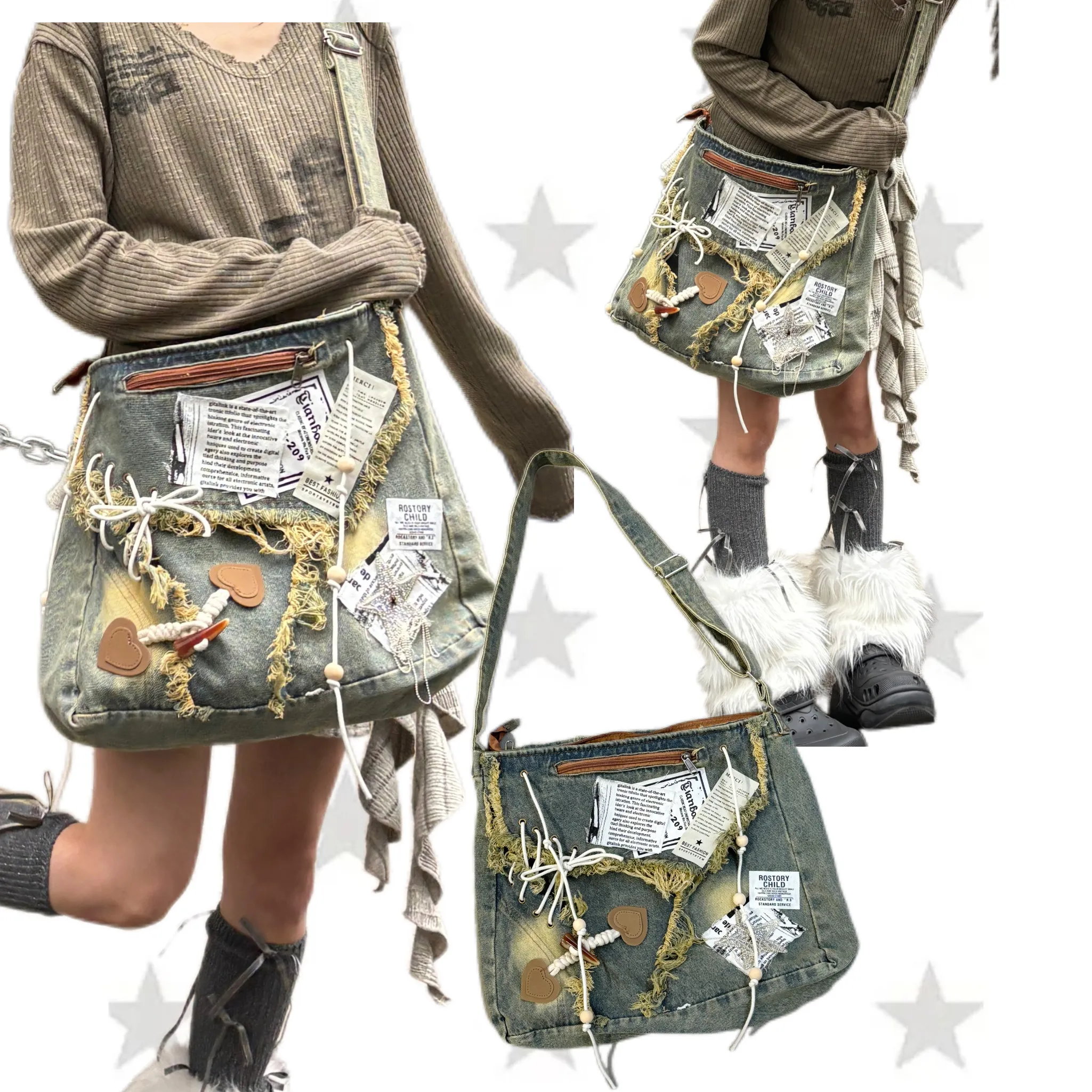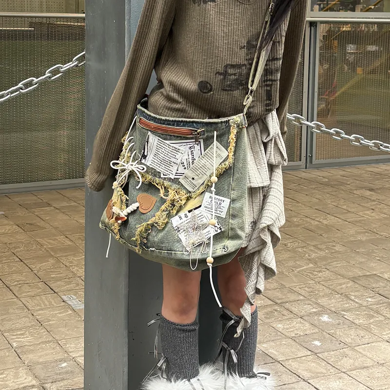 Color classification: shabby style Denim Tassel Crossbody Bag
