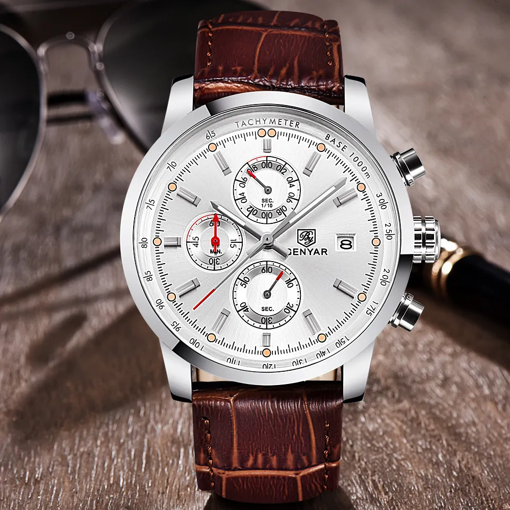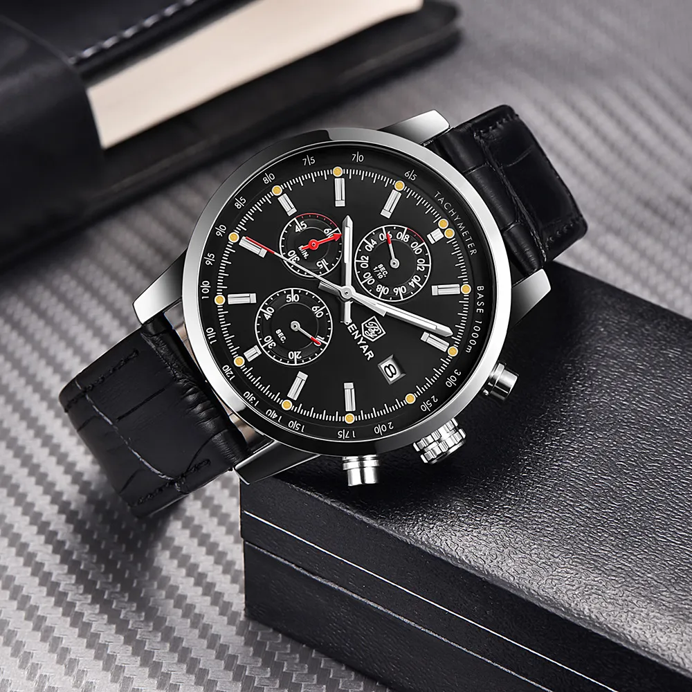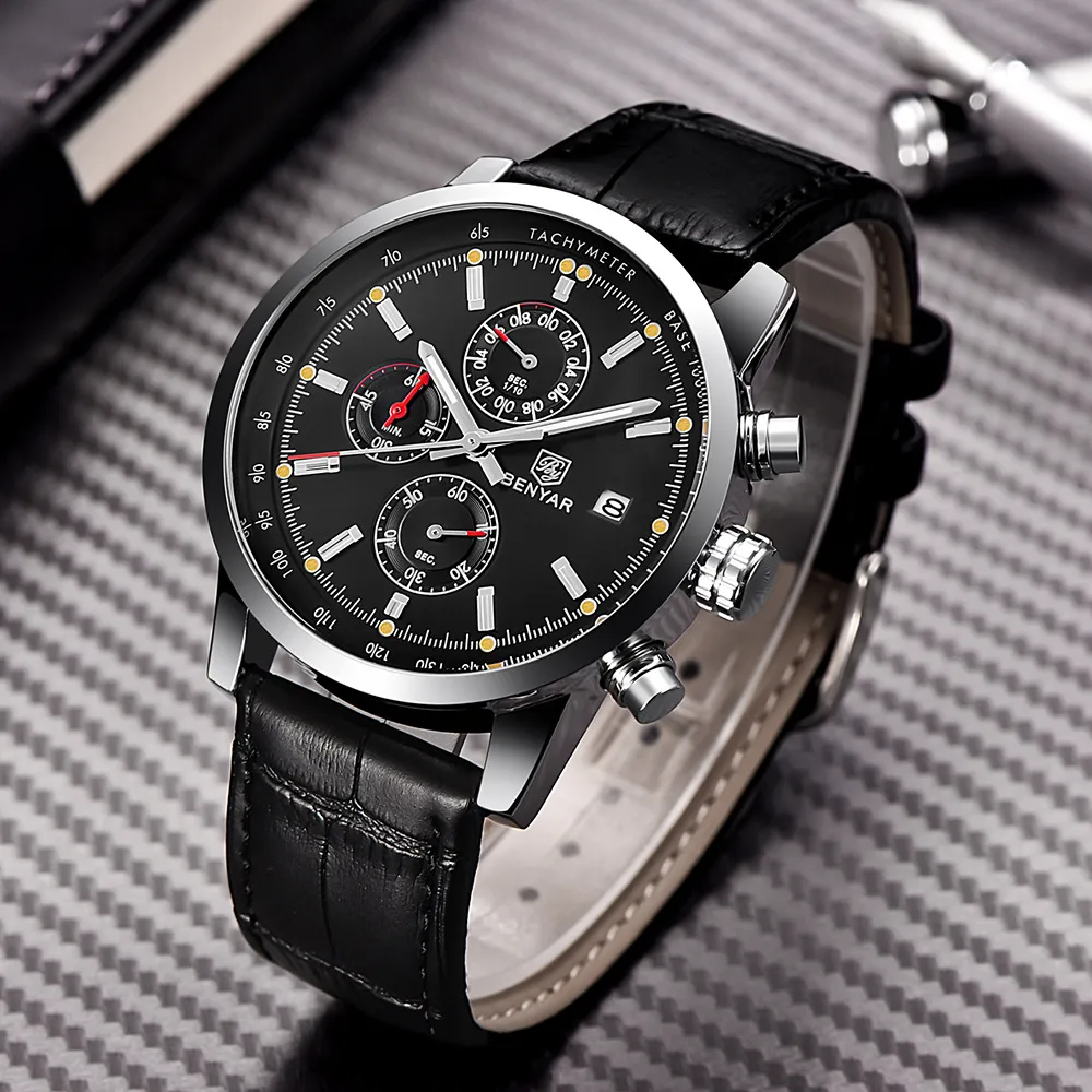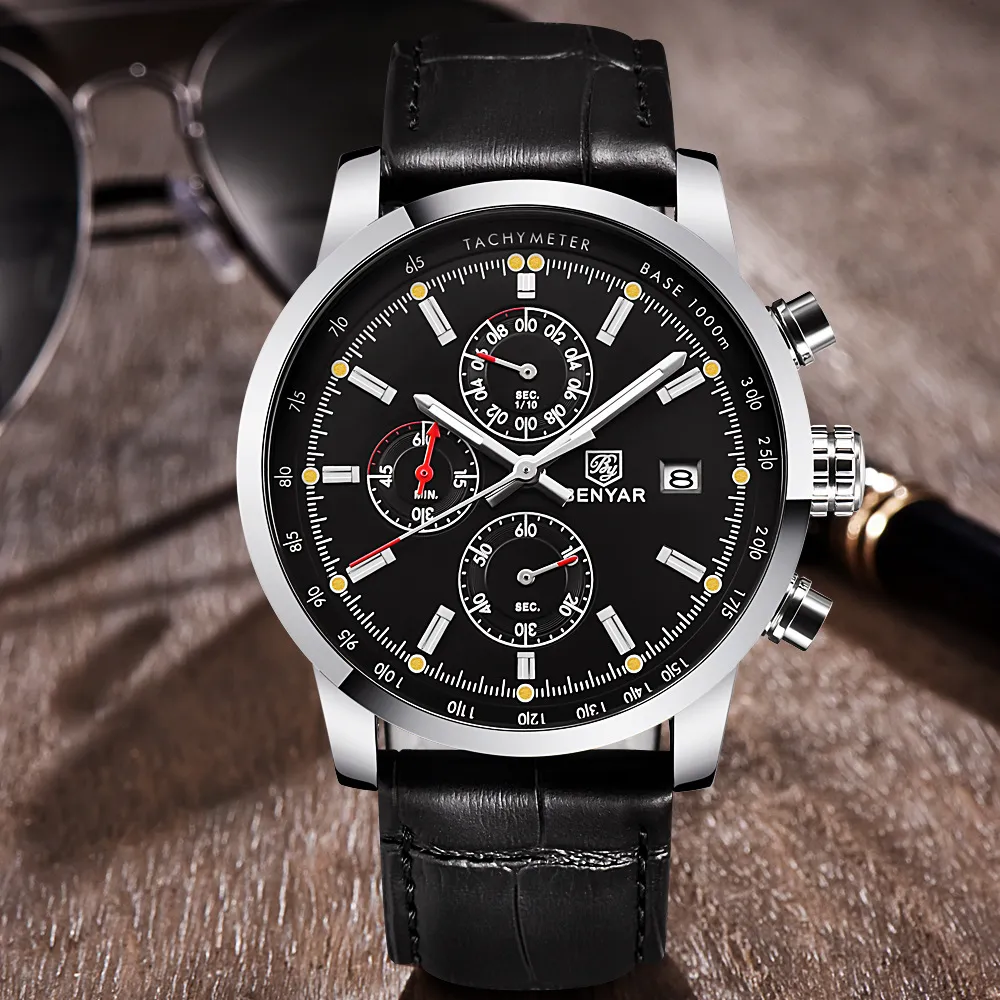 The BENYAR Benya Sports Three Eyed Watch is the perfect blend of style, function, and durability. Whether you're tracking your athletic performance, staying punctual, or adding a bold accessory to your wardrobe, this watch has everything you need. The stylish chronograph design, durable construction, and comfortable leather strap make it a great choice for those looking for a reliable and fashionable watch.