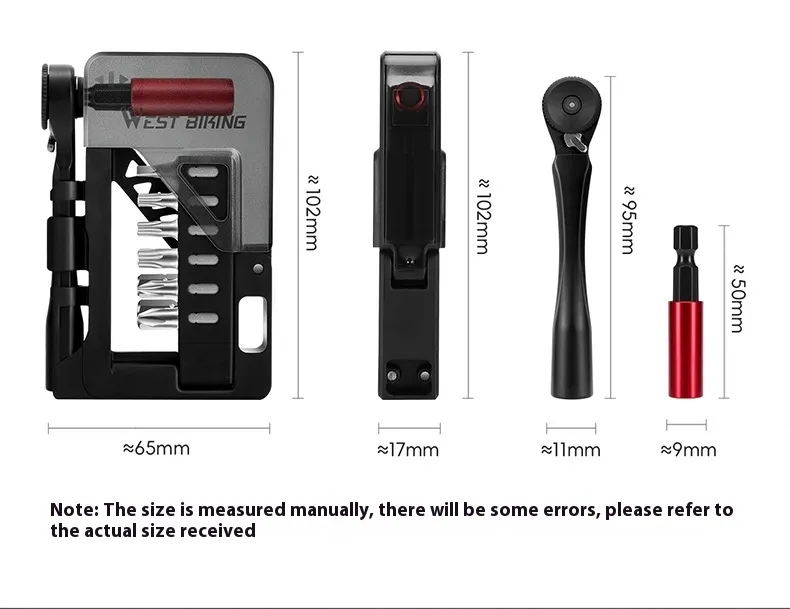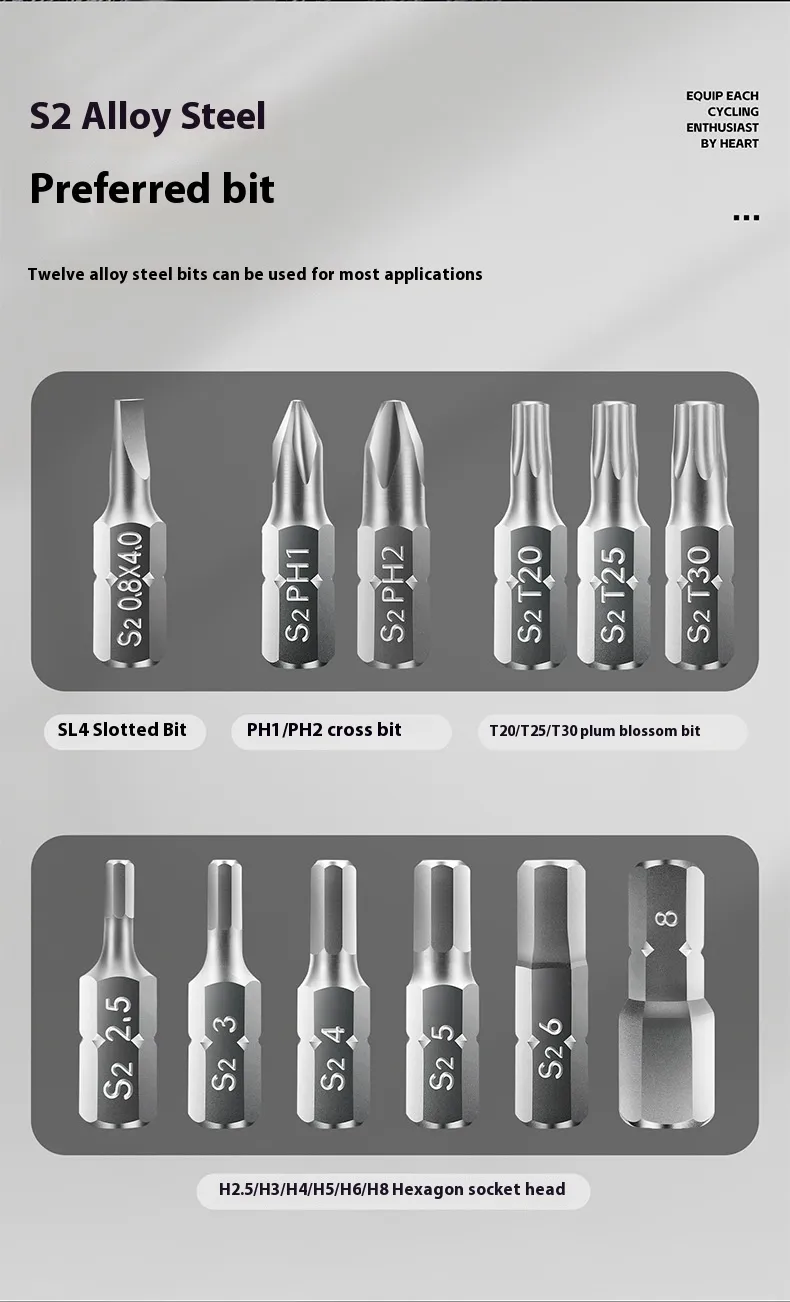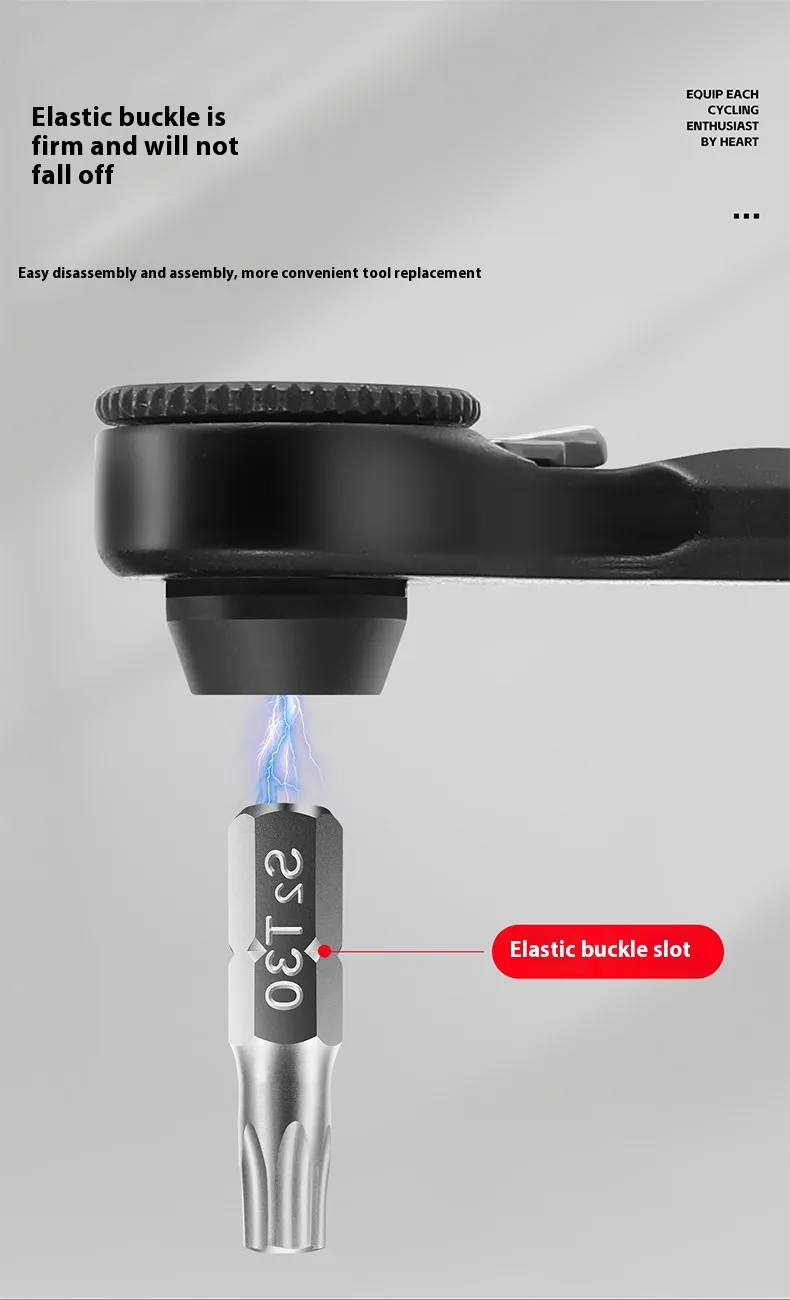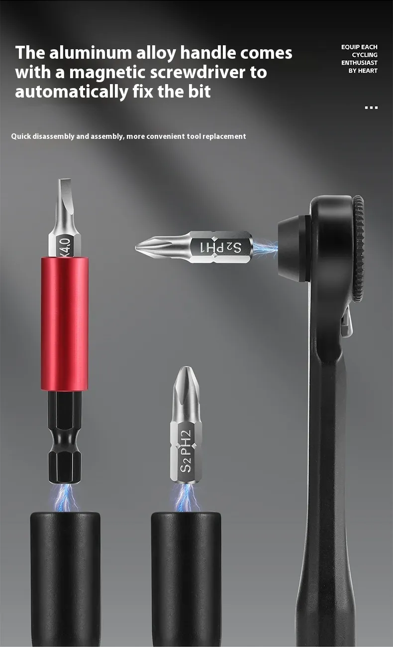 Crafted from high-strength chrome vanadium steel, this set includes a variety of sockets and hex bits to cover most bicycle repair needs. Its quick-release design speeds up workflow while ensuring secure and stable bit changes. Lightweight and portable, it fits easily into your saddlebag or backpack.