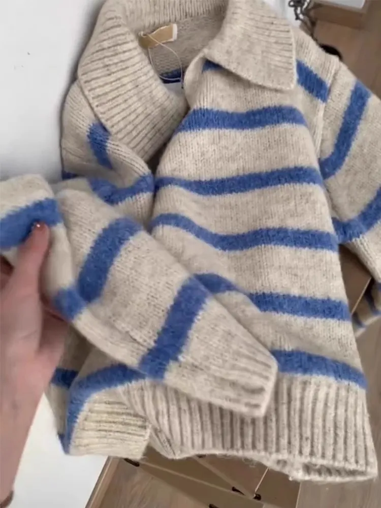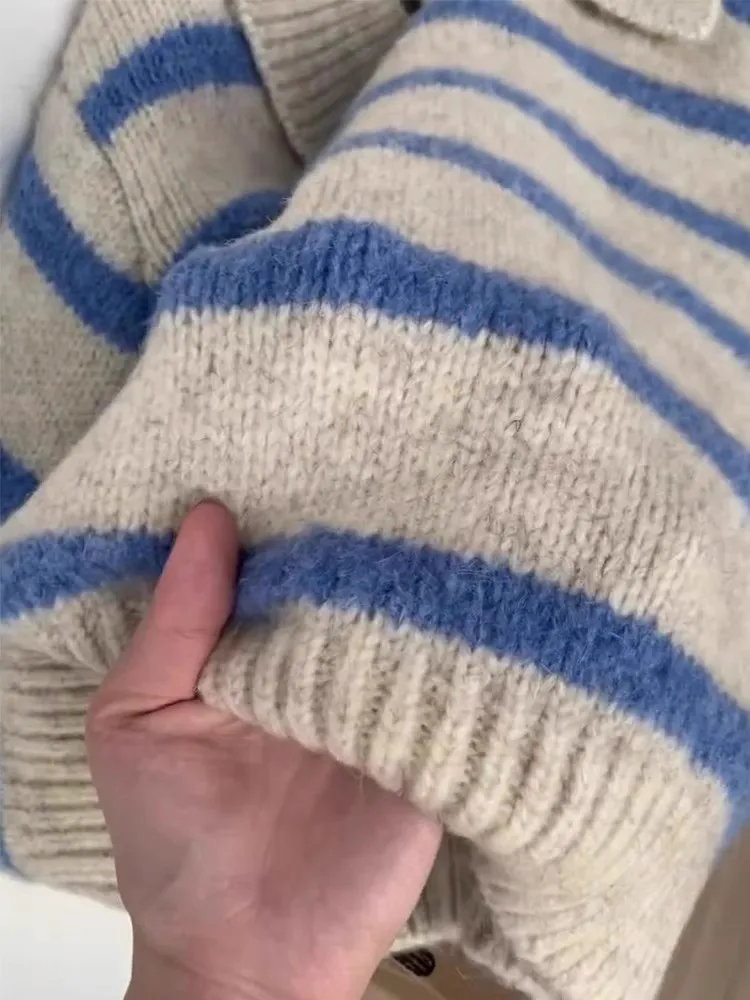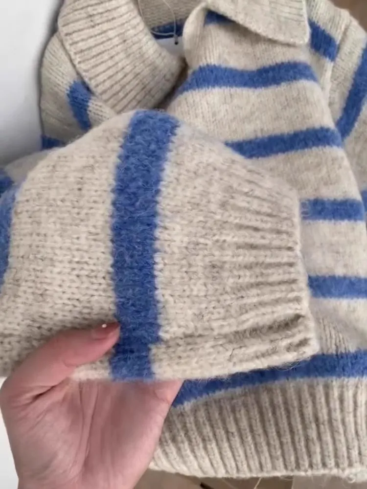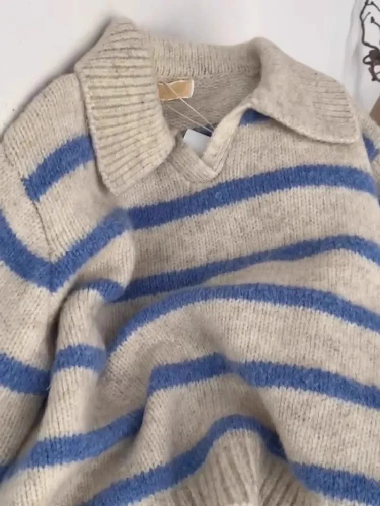 Blue Striped Polo Lapel Long Sleeve Soft Glutinous Sweater