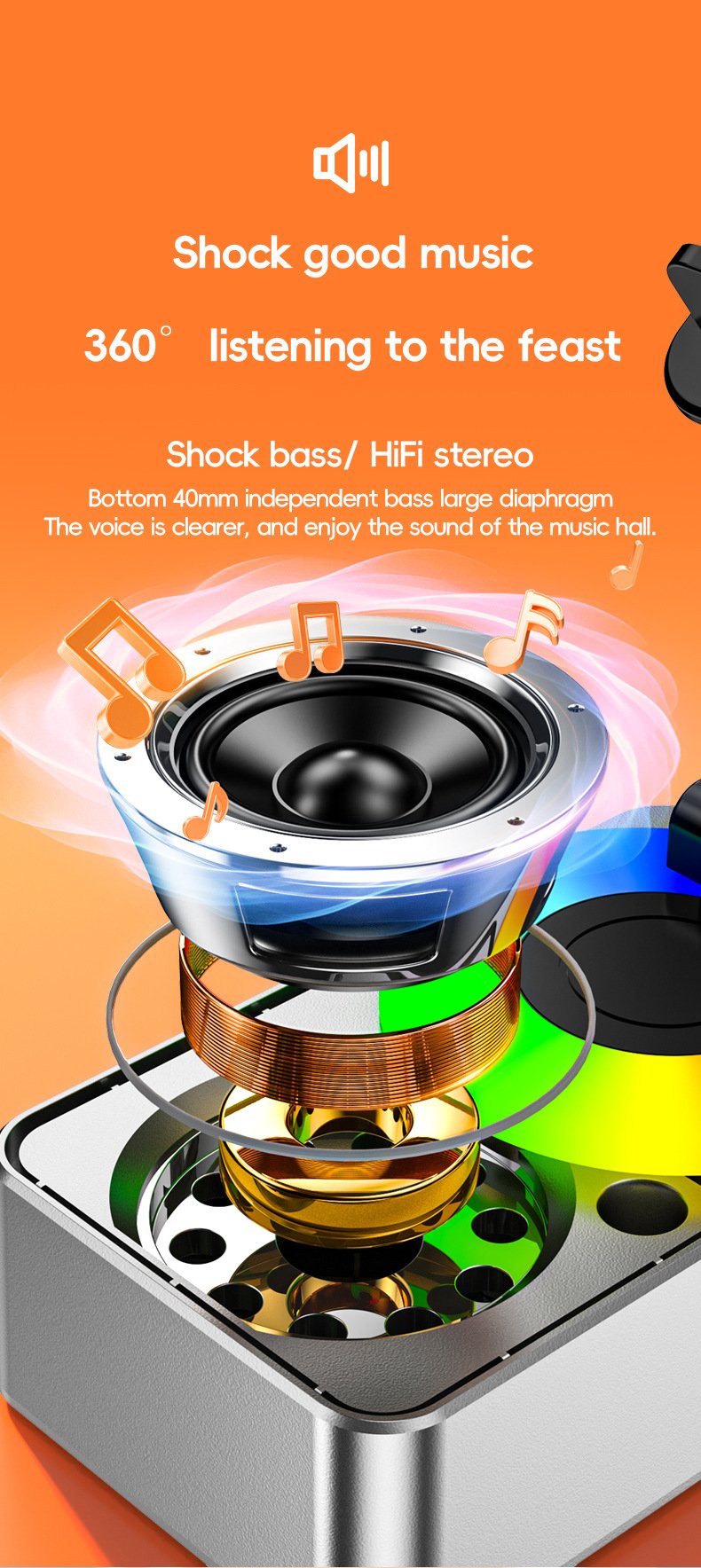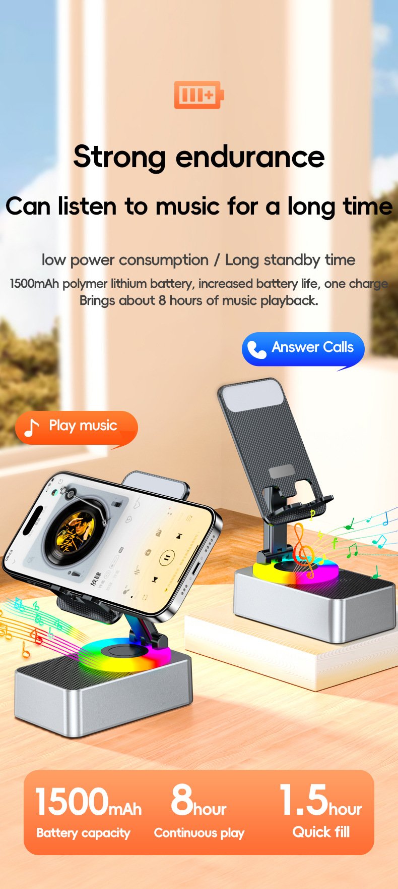 - 【Powerful Wireless Bluetooth Speaker inside the Cell Phone Stand】Driven by 52mm large speakers, up to 5W power output for Powerful deep bass, also built-in microphone for hands-free calls, a 1500mAh battery inside supports 8 hours of continuous playback