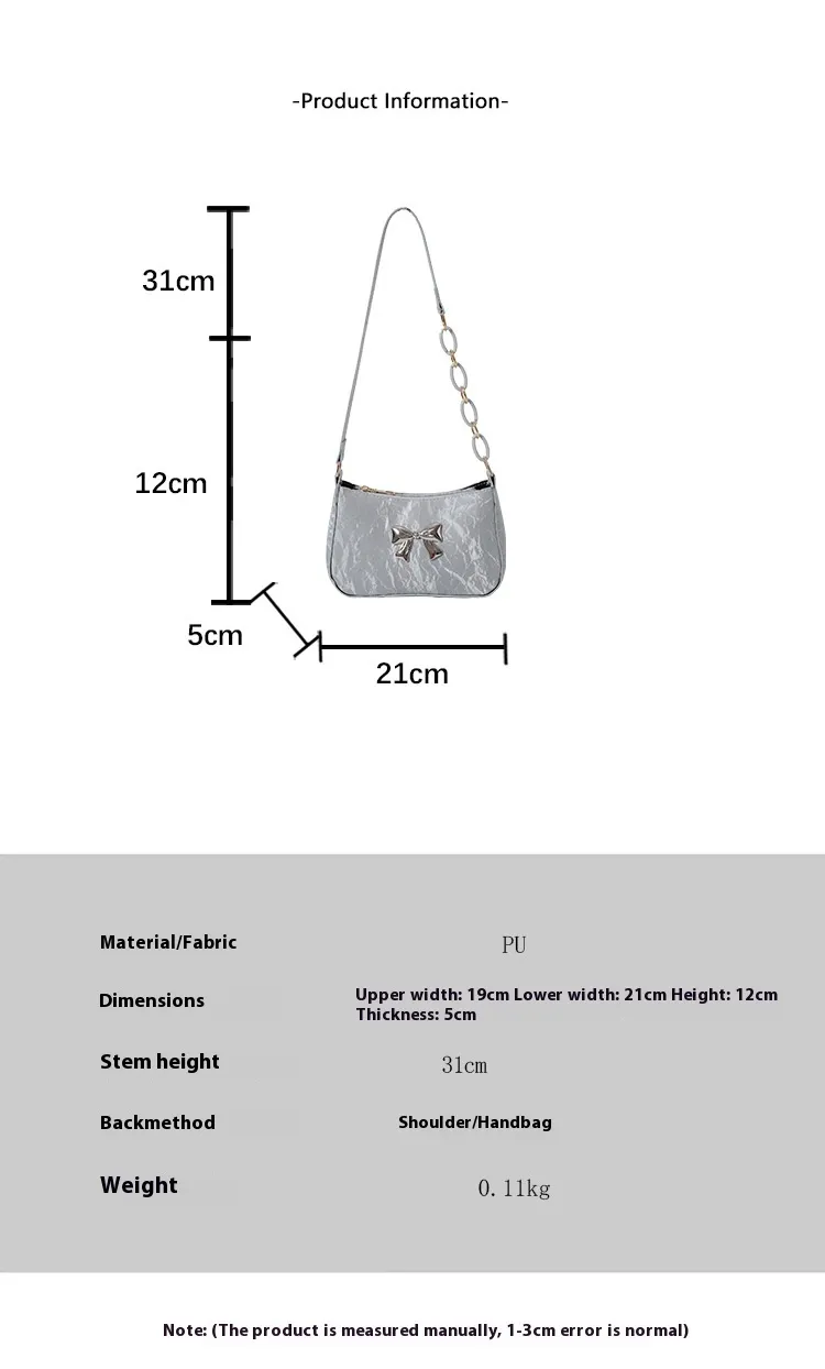 The Bowknot Portable Chain One Shoulder Messenger Bag features a stylish one-shoulder design with an adjustable chain strap, offering comfort and versatility. Whether you wear it casually over one shoulder or use it as an underarm bag, the design adapts to your style and needs.