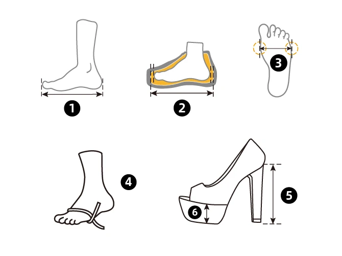 1 Foot LengthMeasure your foot front to back at its longest point2 Shoe Inner LengthMeasure the length from the heel to the toe inside the shoe3 Foot WidthMeasure the widest part of your foot from side to side4 Foot GirthWrap a measuring tape around the widest part of your foot5 Heel HeightMeasure the height from the top of the shoe or boot's heel to the bottom of the heel6 Platform HeightMeasure the height from the where shoe touches the ground to where your foot will be