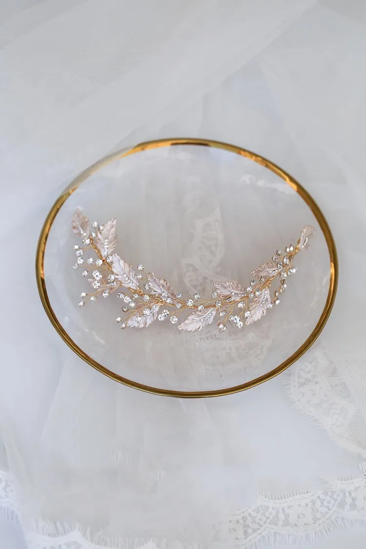 The crown is studded with high-quality rhinestones that catch the light beautifully, adding a subtle yet glamorous sparkle to your hairstyle. The rhinestones are carefully placed along the branches, creating a refined, radiant look that elevates your bridal attire and draws attention to your face, creating a sparkling effect as you move.