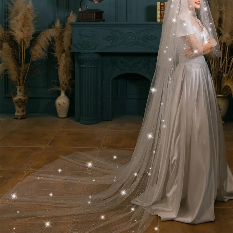 The veil itself is made from high-quality, lightweight fabric that flows effortlessly, adding a touch of romanticism and elegance. The soft material ensures a graceful drape that moves beautifully as you walk, making it perfect for both indoor and outdoor weddings. The veil provides a subtle yet captivating addition to your bridal look, offering a soft contrast to the more structured elements of your dress.