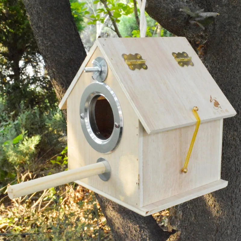 budgies. The wood material provides a familiar environment for the birds, encouraging natural nesting behavior. Additionally, it is