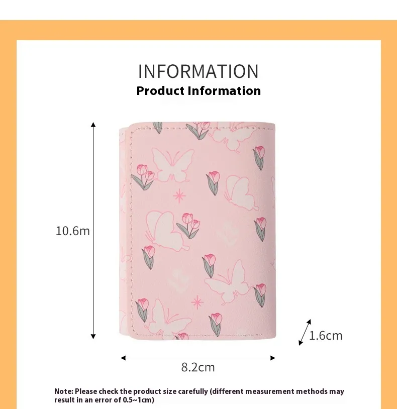 The Butterfly-Patterned Short Style Three-Fold Wallet is designed to be compact and lightweight, making it easy to slip into your bag, pocket, or purse without adding unnecessary bulk. Its practical size ensures it can hold all your essentials while maintaining a slim profile.