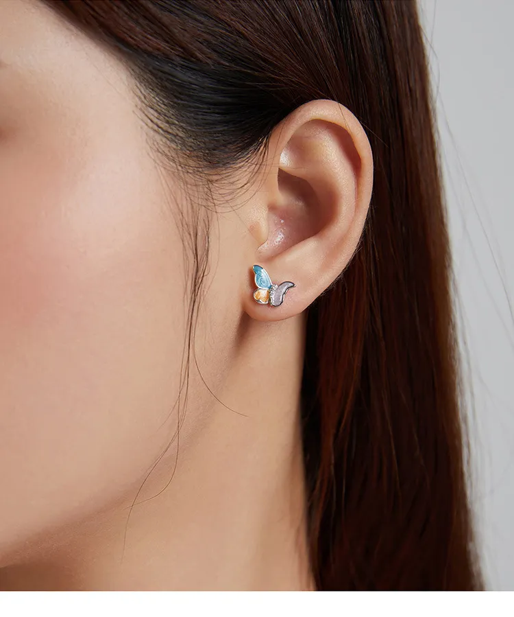 Butterfly Sterling Silver Earrings White Gold Plated Colorful Oil Necklace