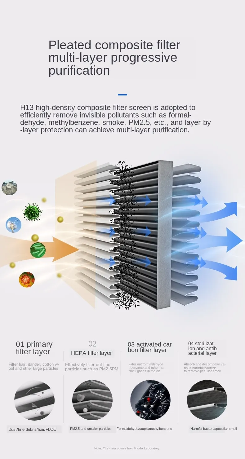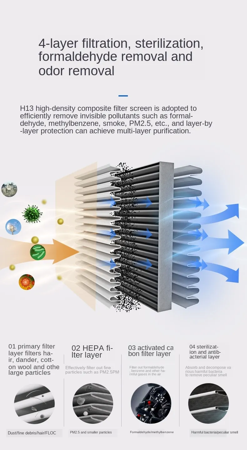 3. Equipped with a high-mesh activated carbon filter, which can efficiently adsorb toxic and harmful gases such as formaldehyde and benzene.