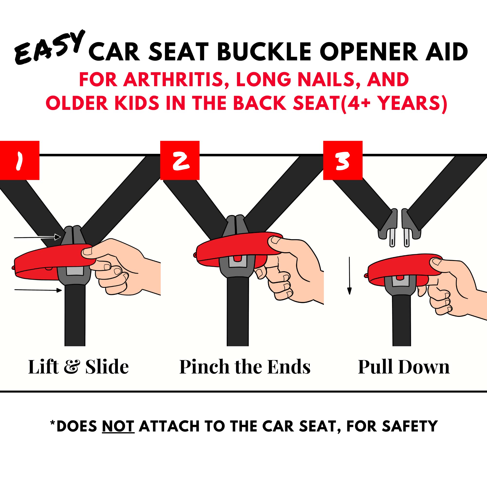 - Works as an opener on all child car seat buckles (including infant rear-facing, convertible and booster seats that use a 5 point harness seat belt) and many strollers, high chairs and other push-button devices