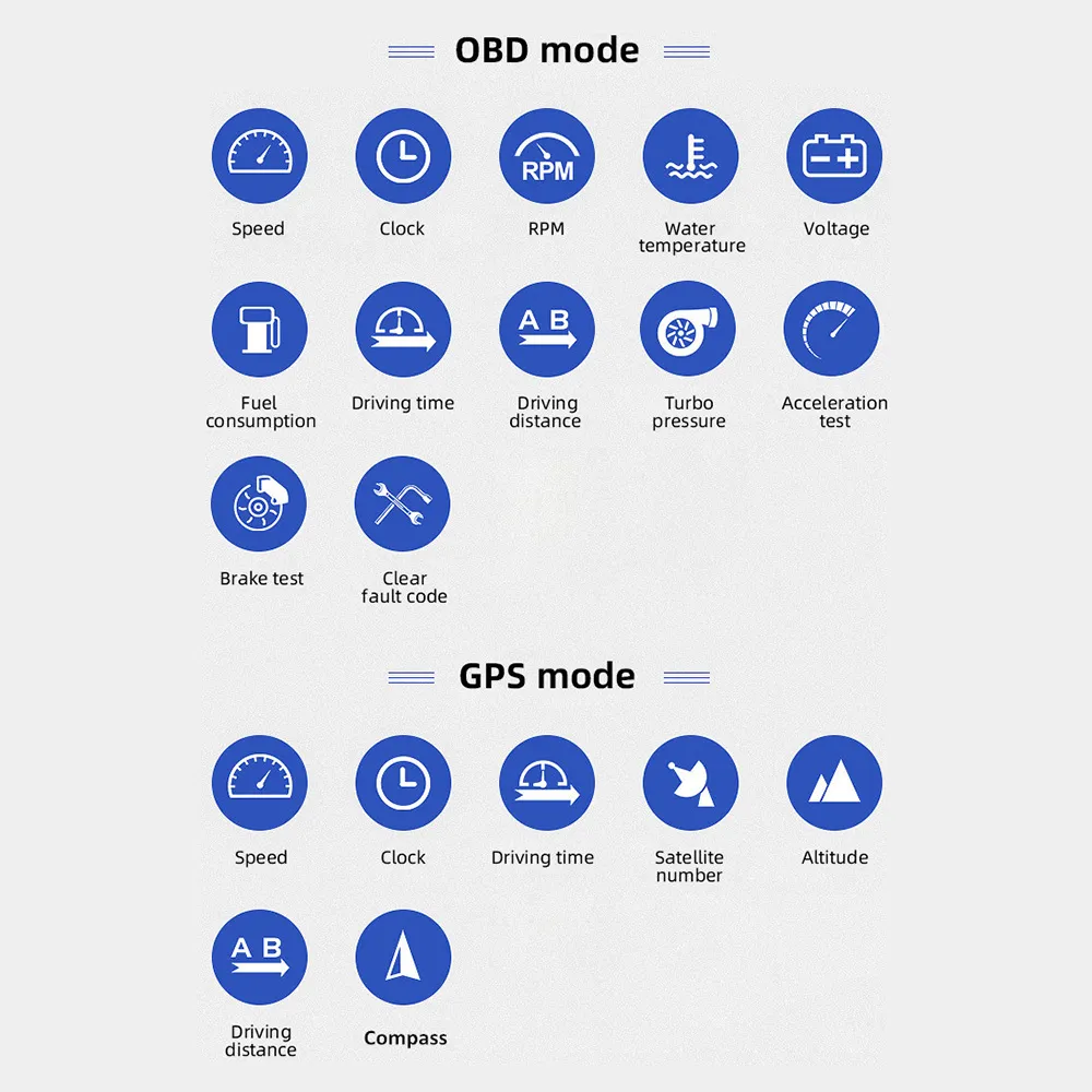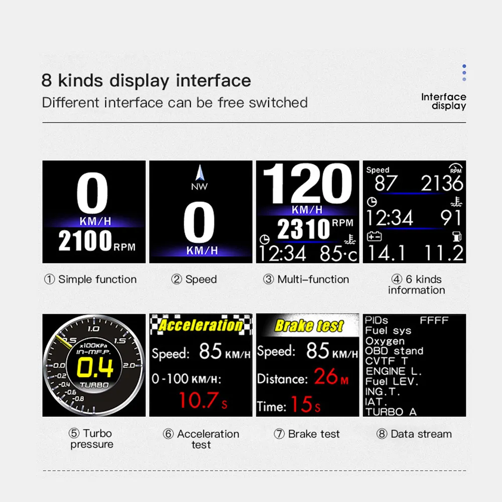 Function: A-pillar installation of OBD+GPS smart HUD LCD code table dual system