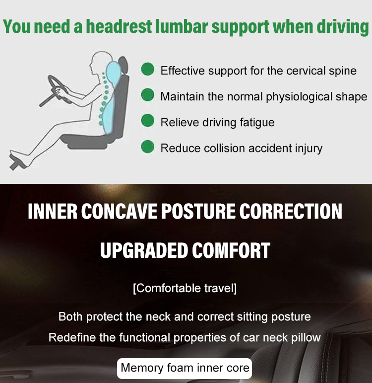 - 【Car Neck Pillow for Driving】The surface is concave and centered, which wraps the neck well and provides three-point comfortable supports for the head, neck and shoulders. Ergonomic car seat headrest & lumbar cushion guide your body into the right position and reduce the strain on your neck. The adjustable strap makes it very easy to install and adjust to the proper height.