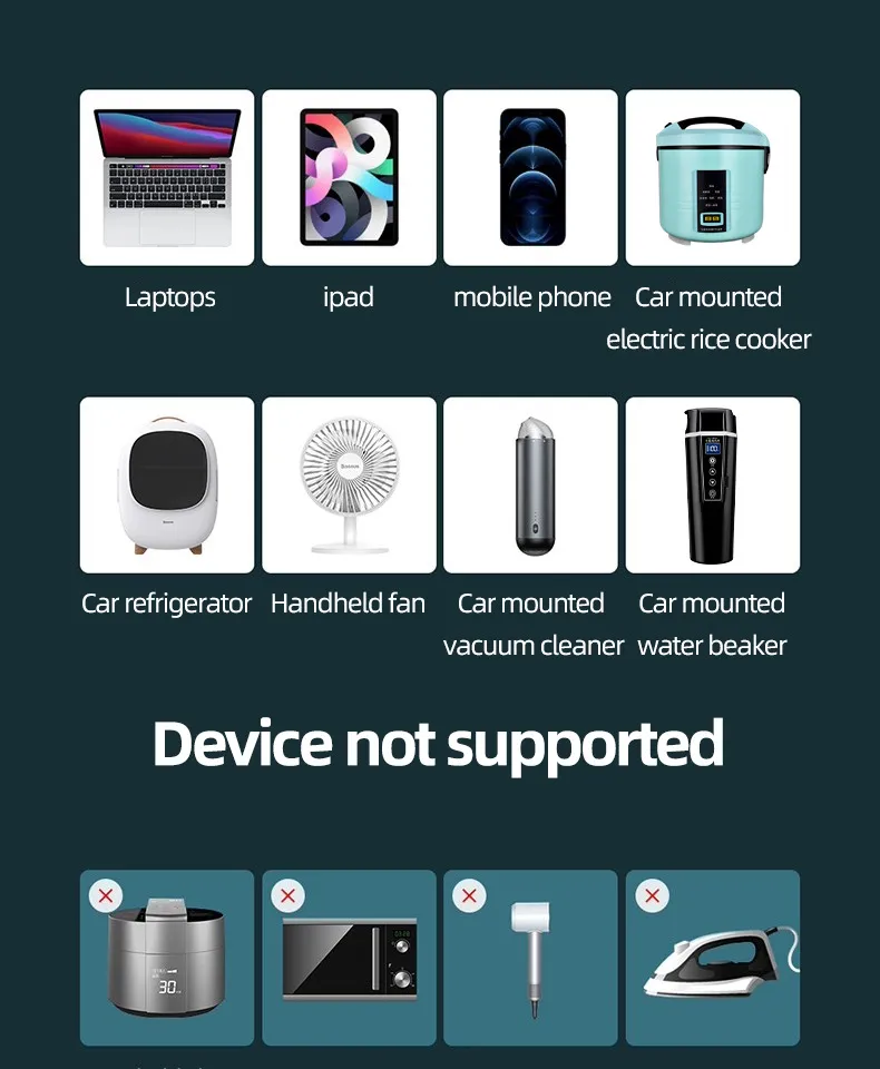 devices, from laptops to small appliances, up to a specified wattage limit.