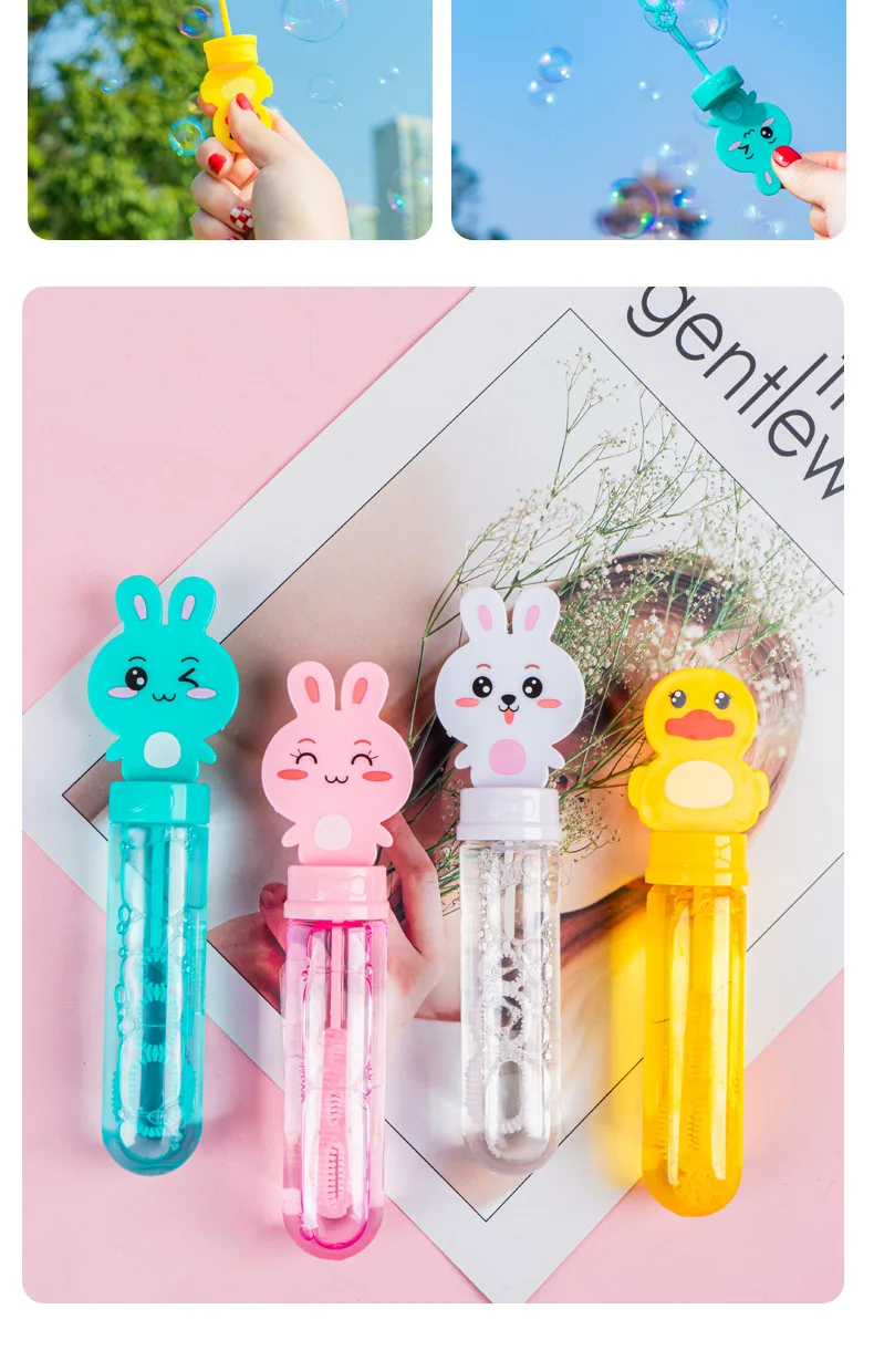 Bring joy and excitement to your children's outdoor playtime with these adorable Cartoon Mini Bubble Sticks. Featuring charming duck, dinosaur, and rabbit designs, these fun and interactive bubble toys are perfect for kids. Ideal for summer activities, parties, and as playful gifts, these bubble sticks provide endless bubble-blowing fun.