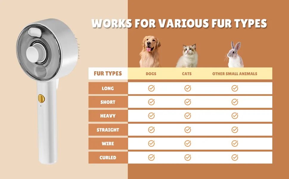 【Adjustable Dual Spray Modes & One-Click Hair Removal】Featuring two adjustable spray modes, this steam cat brush allows you to choose the mist intensity based on your pet’s fur type. A long press activates the purple light, aiding in thorough cleaning. The fine mist helps manage pet hair, and the one-click hair removal button ensures easy cleanup after grooming. This cat deshedding brush is perfect for maintaining a tidy, healthy coat with minimal effort.