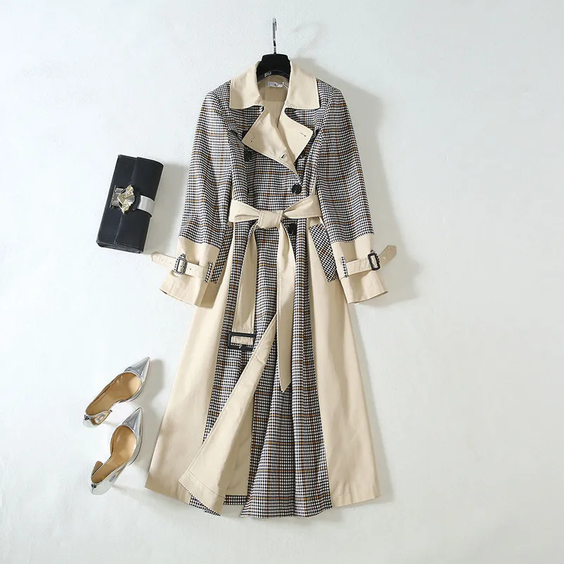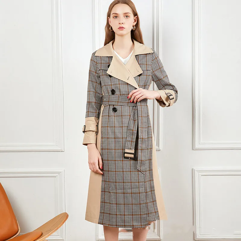 Checked Stitching Lace-Up Waist Long Trench Coat – Stylish and Feminine Outerwear