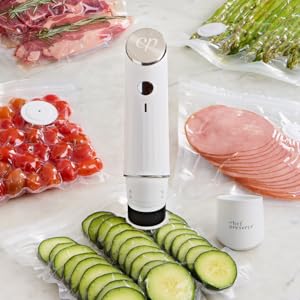 The Chef Preserve Compact Vacuum Sealer is a rechargeable, handheld device that allows you to vacuum seal your food in less than 5 seconds.