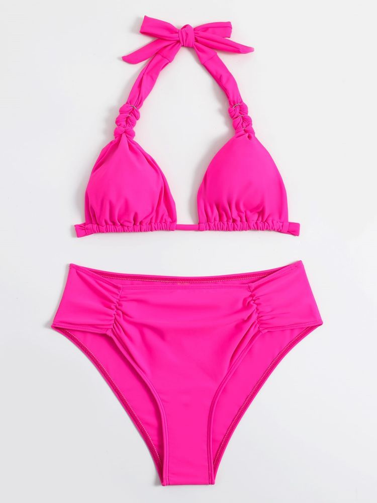 The bikini top boasts a delightful bow-tie halter design, providing not only an adjustable and customizable fit but also a charming, feminine touch. The bow-tie detail adds a playful yet sophisticated element, making it a standout feature of this set. The ruched detailing along the straps enhances the aesthetic appeal, adding a layer of elegance and sophistication. The classic triangle cups are designed to flatter and support, creating a beautiful silhouette that complements all body types. Made from high-quality, stretchy fabric, this top ensures a comfortable, secure fit that allows for all-day wear without compromising on style or comfort.