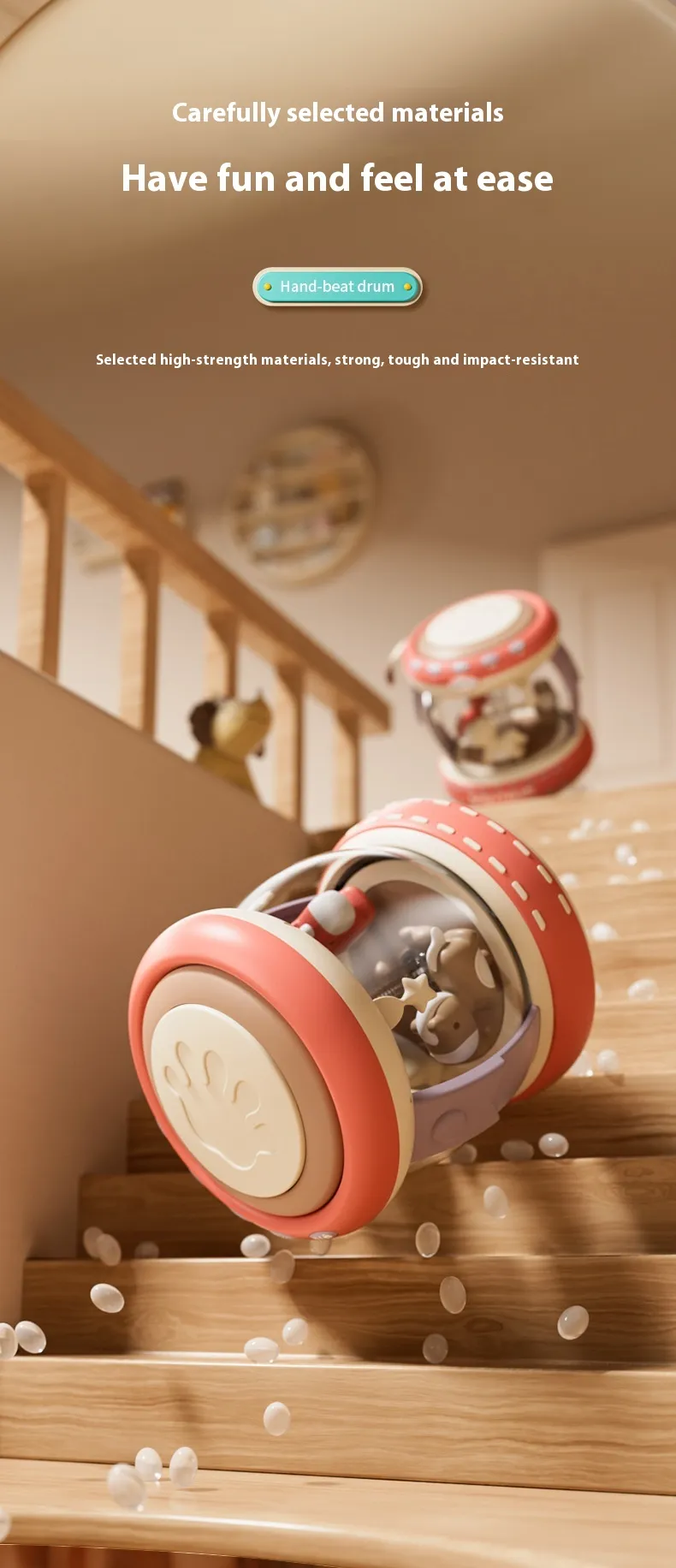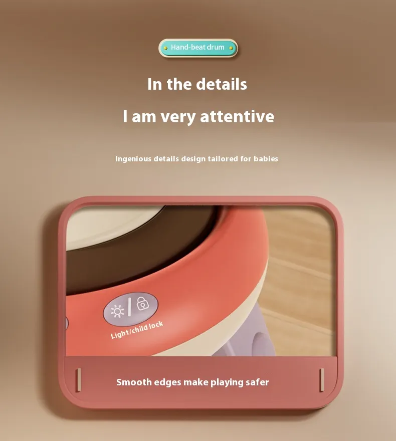 The drum is designed with a comfortable grip, making it suitable for children of all ages to hold and play. Its shape and design are perfect for little hands, encouraging children to tap, drum, and create sounds independently, all while developing their musical sense.
