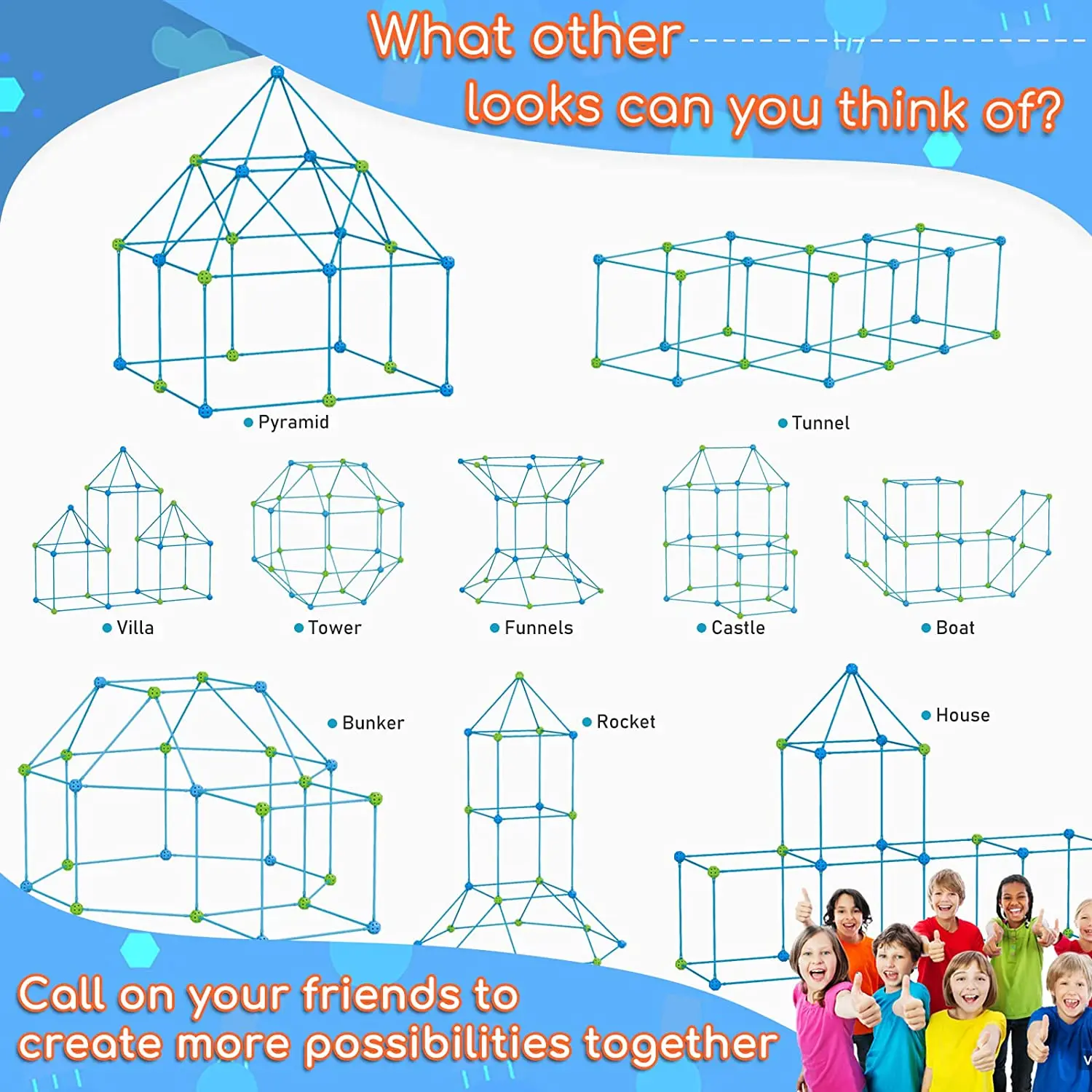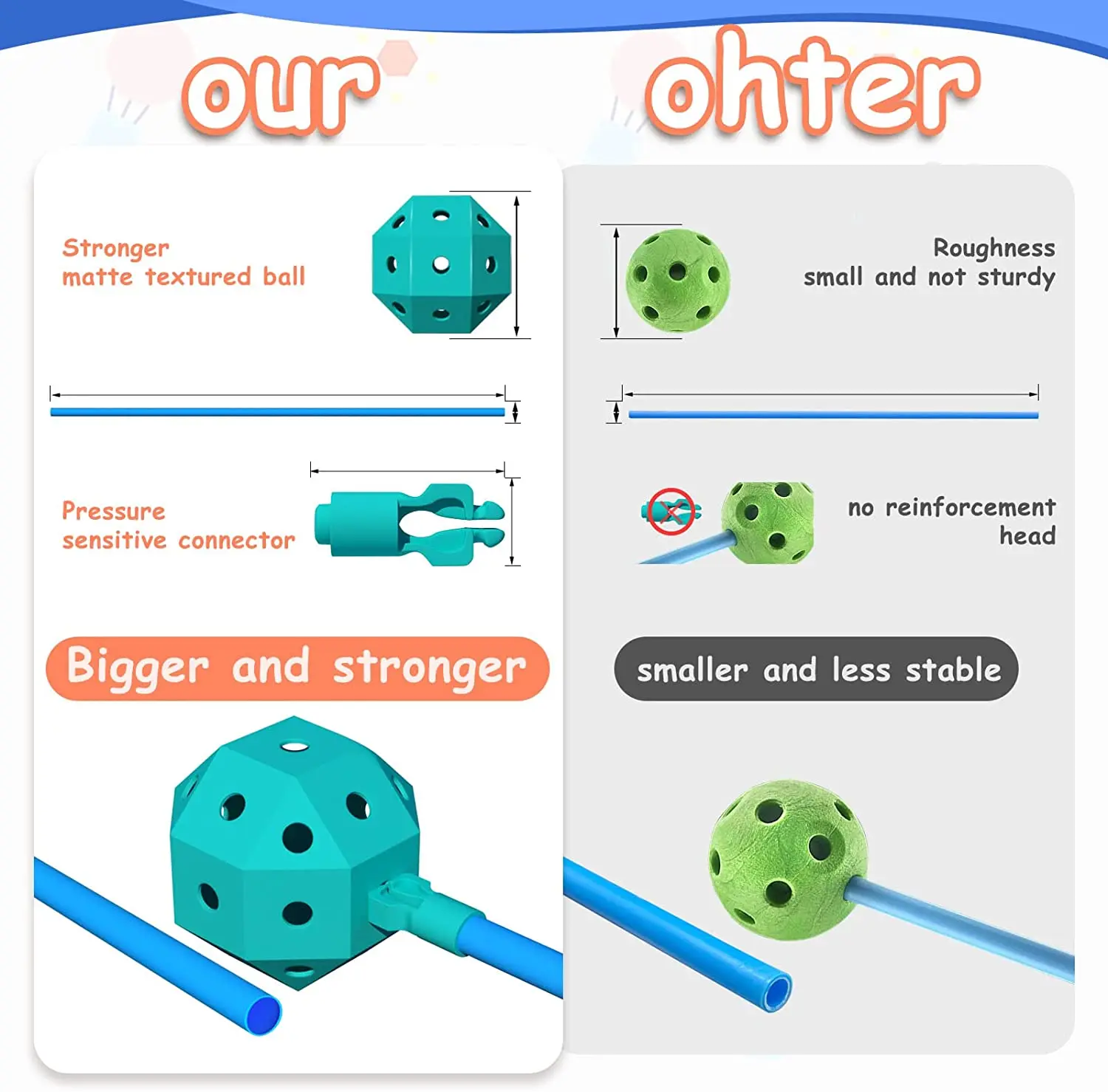 4.【Easier to build and stronger】: As a large construction toy, the biggest problem is the stability of the structure. It can be very frustrating when kids build tent shapes and then fold them in an instant. We have improved this issue. We integrated the interface with the stem, improving the way the structure and ball snap together. Children can easily complete the assembly and disassembly without requiring a lot of strength, and the structure is more stable.