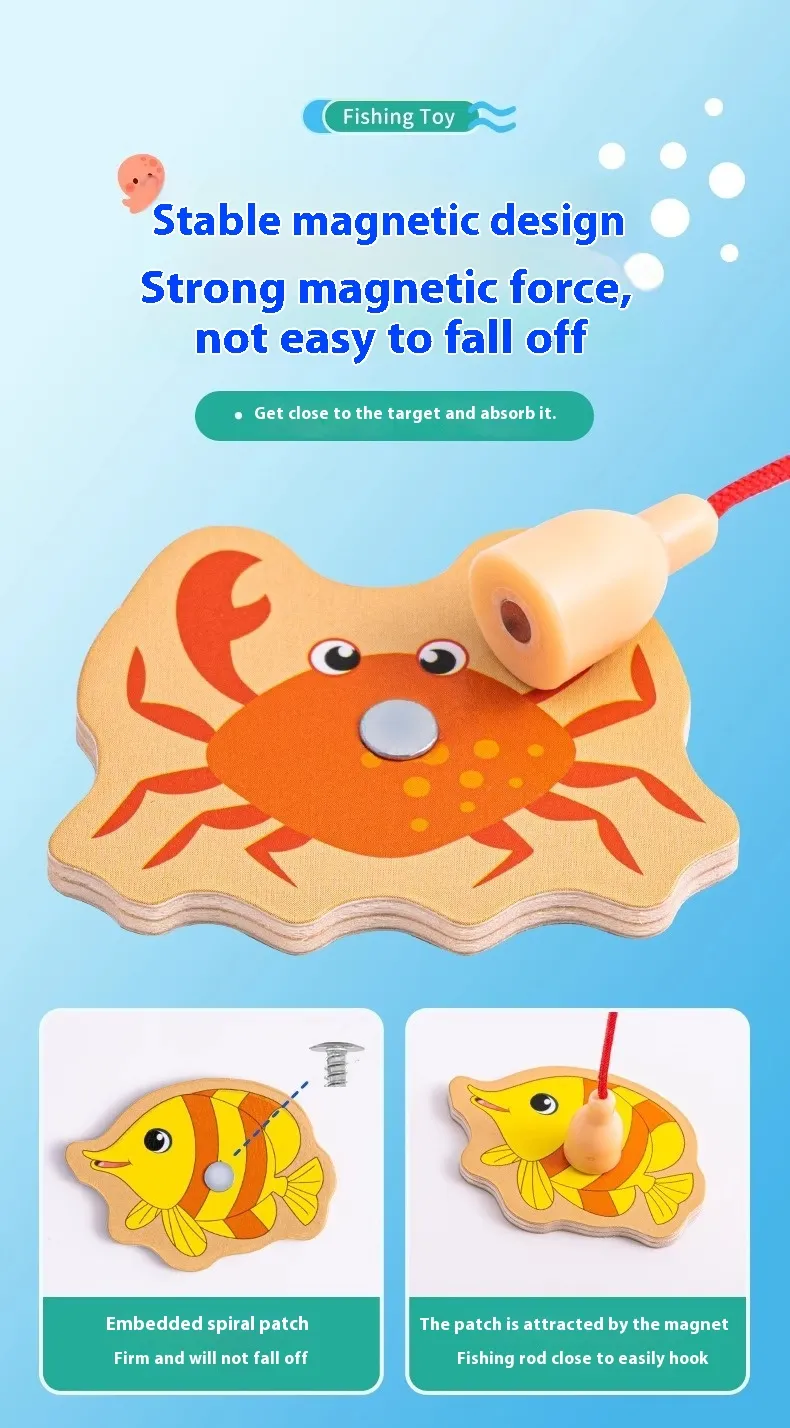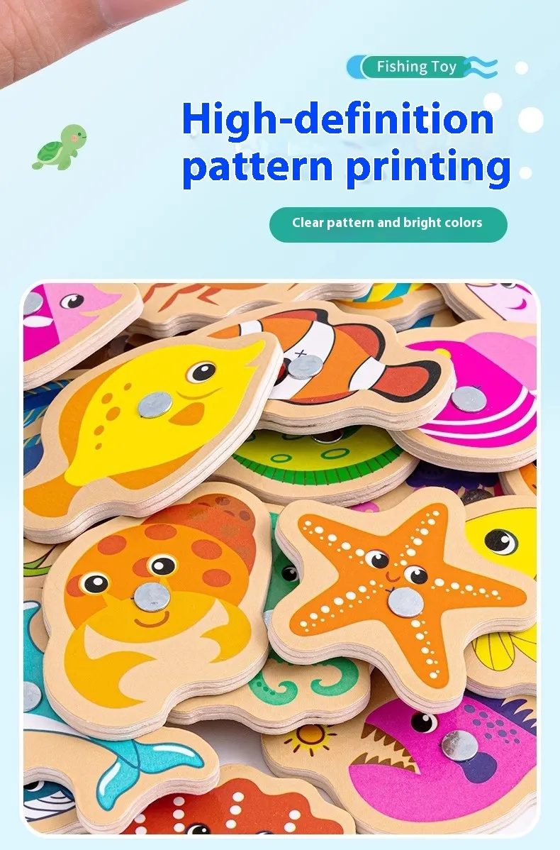 The set includes a colorful wooden fishing rod with magnetic "hooks" and a selection of brightly colored fish that also feature magnets. Your child will enjoy trying to catch the fish using the fishing rod, which promotes both fun and learning. The simple magnetic feature makes it easy for younger children to engage in this activity, while also allowing them to practice their grasp and control skills as they try to catch the fish.