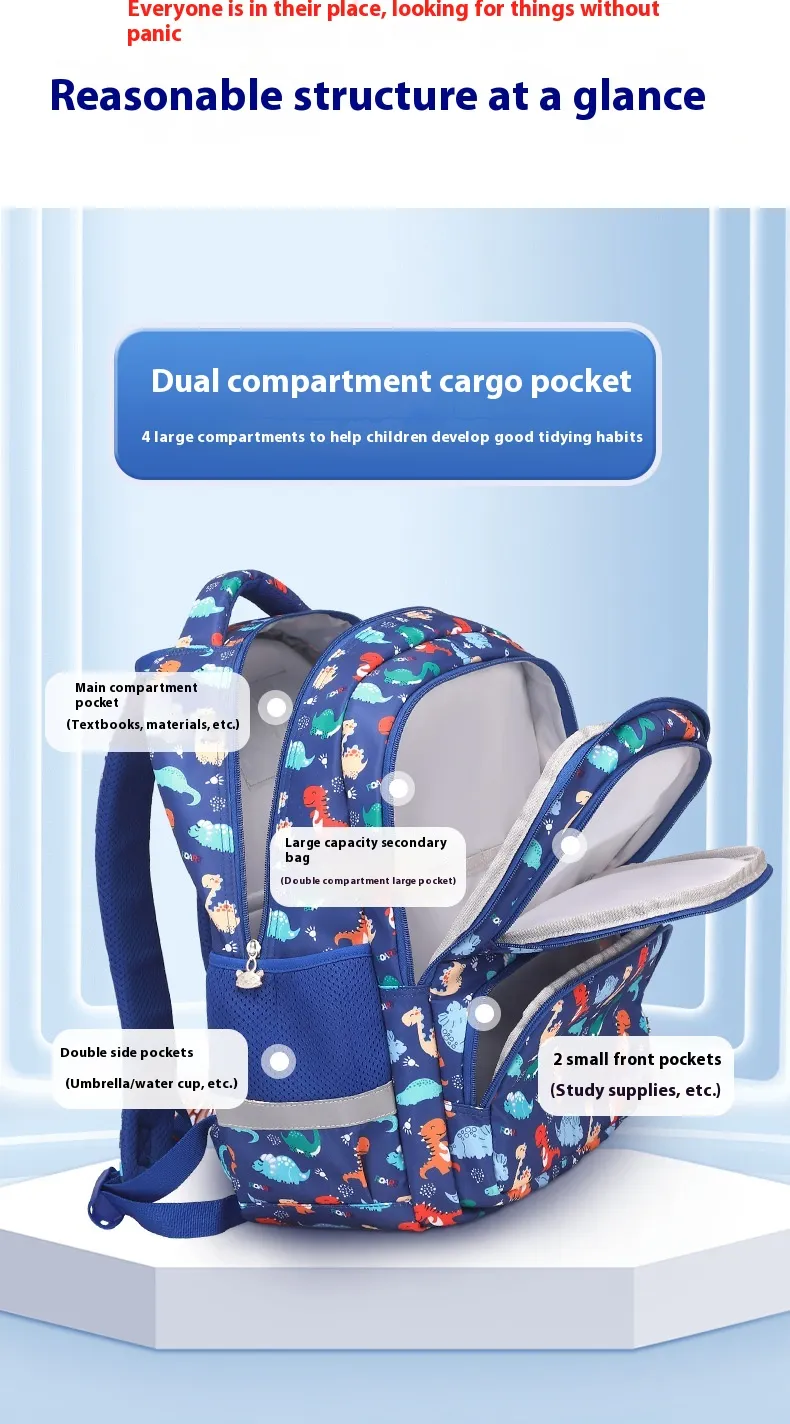 Designed with multiple compartments, the backpack offers plenty of storage space for school essentials, including: