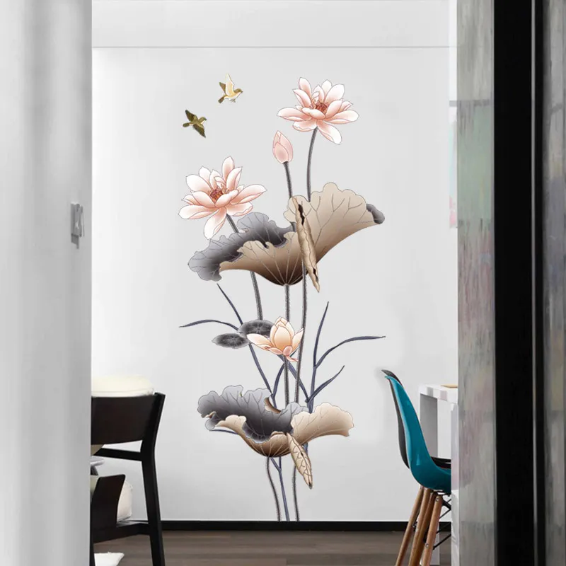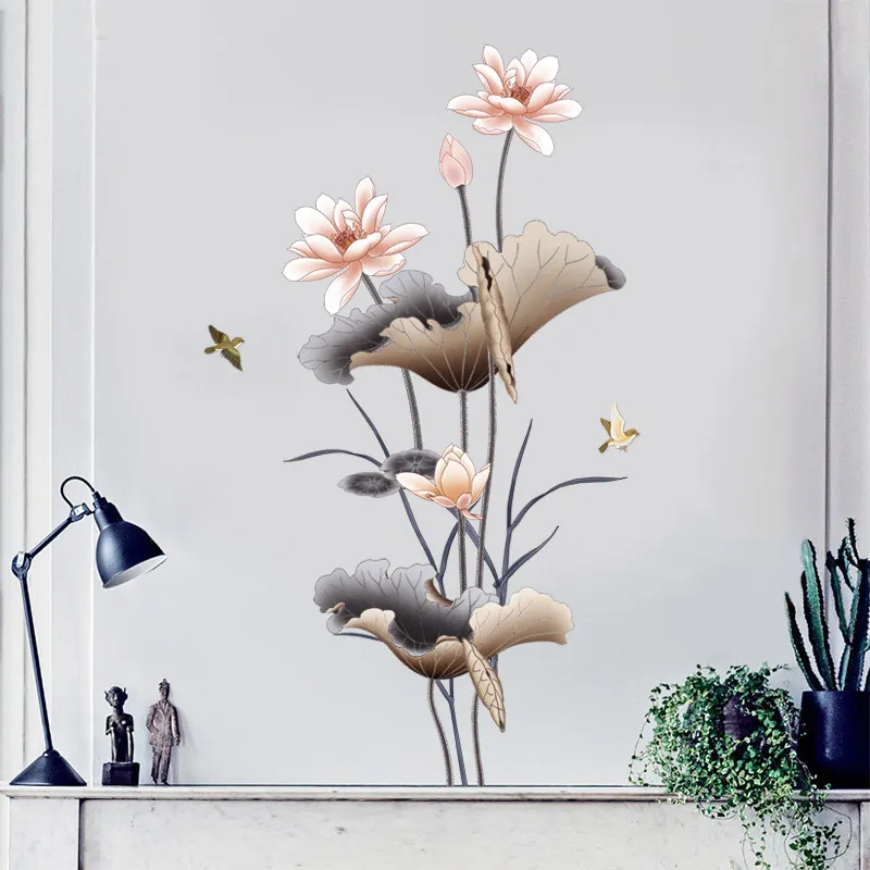 Chinese Style Lotus Flower Wallpaper Self-adhesive Living Room Decor Sofa Background Decoration Wall Stickers