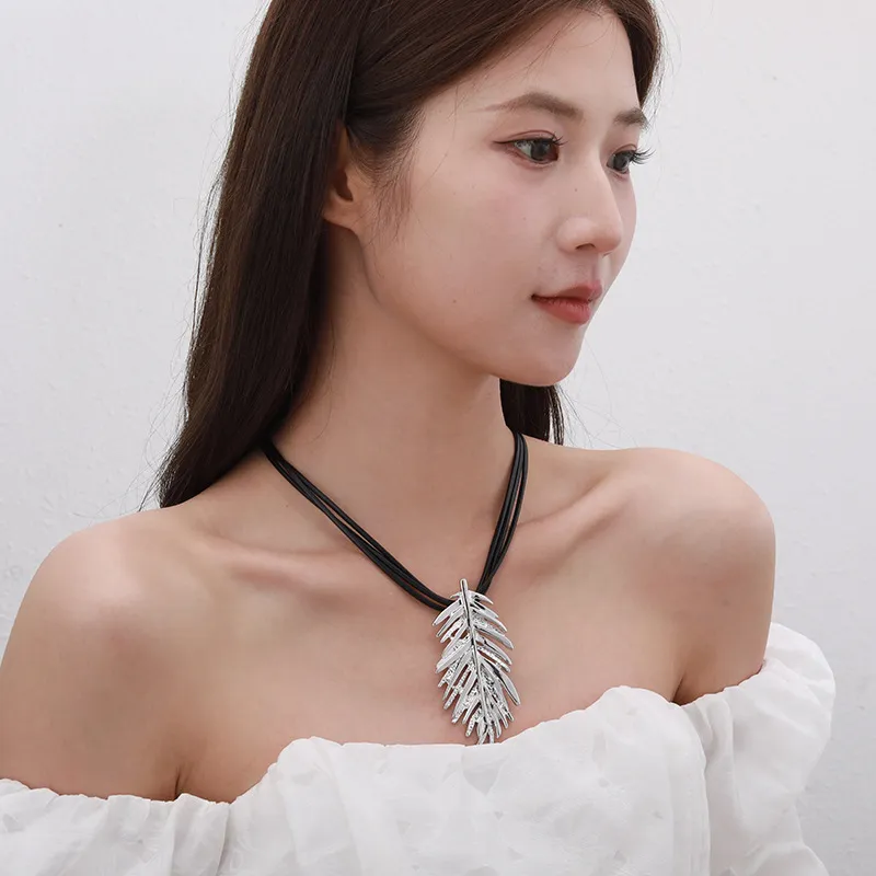 modern designs with a touch of elegance. Featuring a stylized leaf pendant and choker