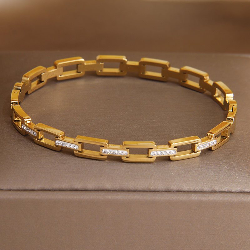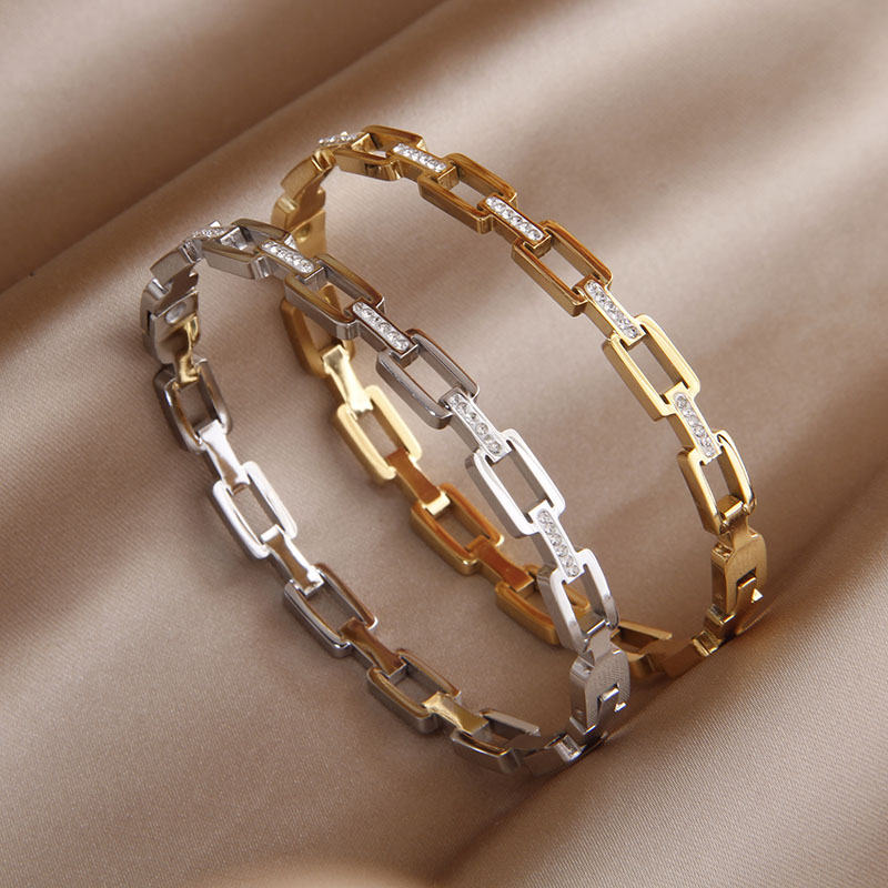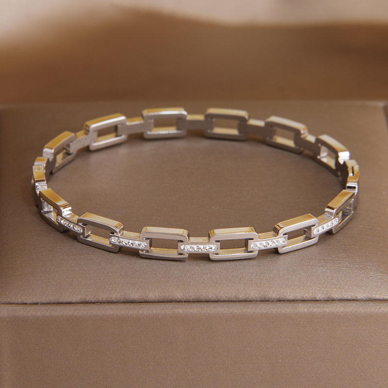 Maintain your Classic Stainless Steel Hollow Geometric Charm Bracelet by gently wiping it with a soft cloth after wear. Avoid exposure to harsh chemicals, perfumes, and moisture to keep the crystals sparkling and the metal shining. Store in a jewelry pouch or box to prevent scratches.