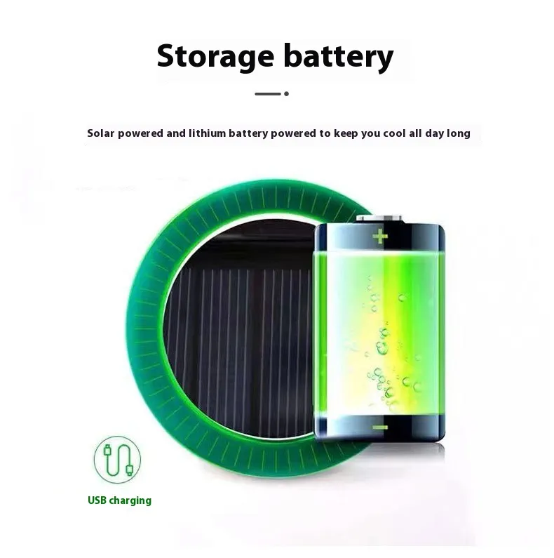 Built-in Cooling Fans: Two high-performance fans powered by solar panels and USB charging to provide consistent cooling.