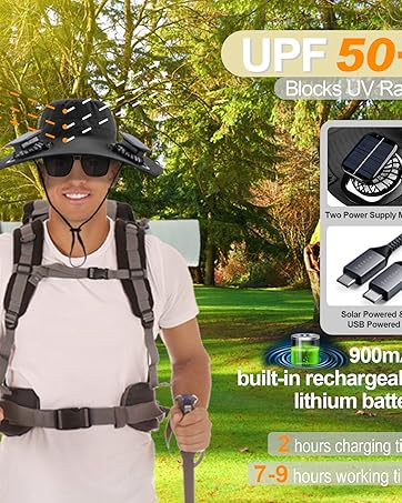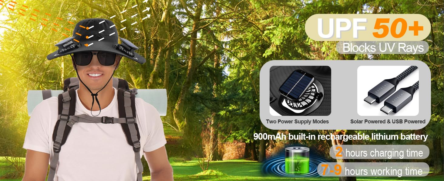- Wide Brim Hat with Fan: You will get 1 x wide brim sun hat, which is built-in 2 x solar fans, and 2 x USB cables. You can hang the outdoor fishing sun cap around your head and take it everywhere