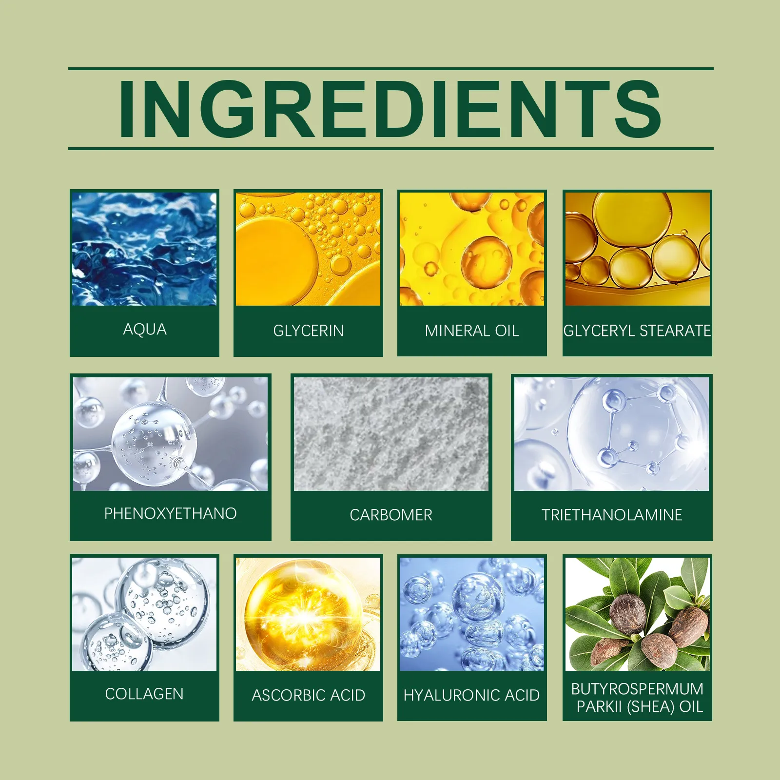 Ingredients: Water, glycerin, mineral oil, Glyceryl stearate, phenoxyethanol, carbomer, triethanolamine collagen, vitamin C, hyaluronic