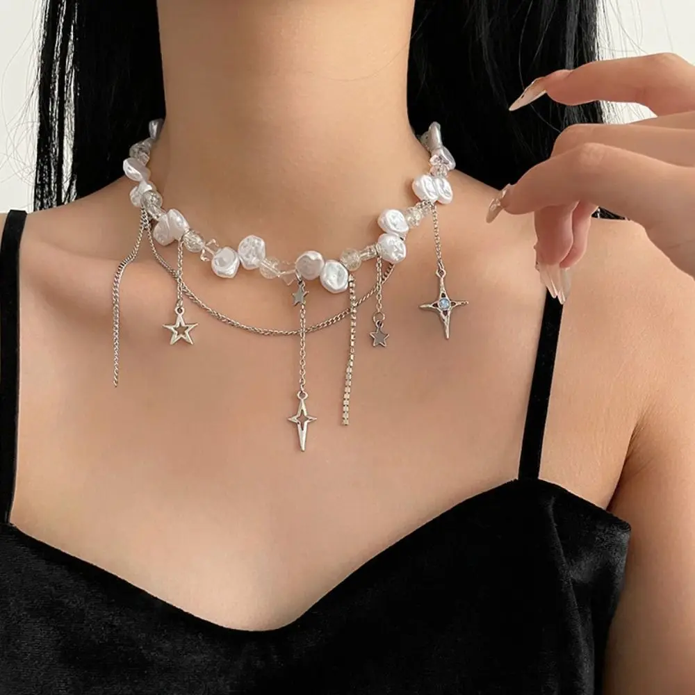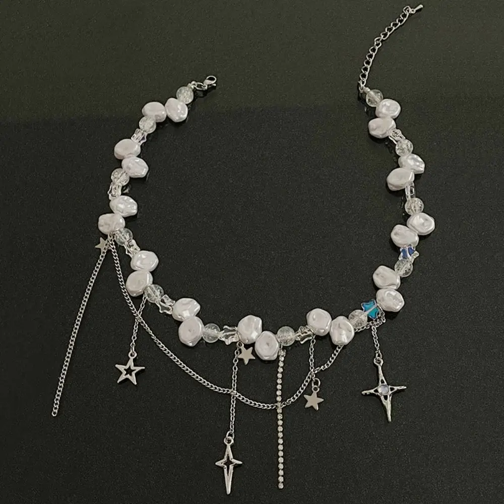 The Collar Bone Baroque Pearl Choker Necklace is a bold and trendy accessory designed for modern women who love making a statement. Featuring a unique mix of baroque pearls, colorful beads, and whimsical star accents, this choker is the perfect combination of elegance and hipster fashion. With its overlay pearl chain design, this necklace sits gracefully on the collarbone, adding a touch of playfulness and sophistication to any outfit.