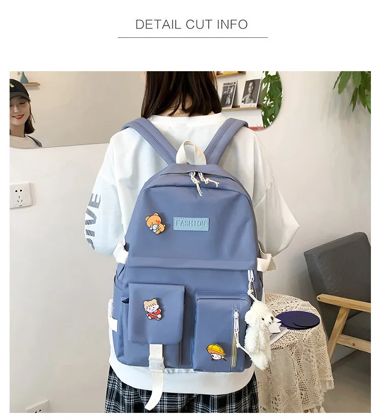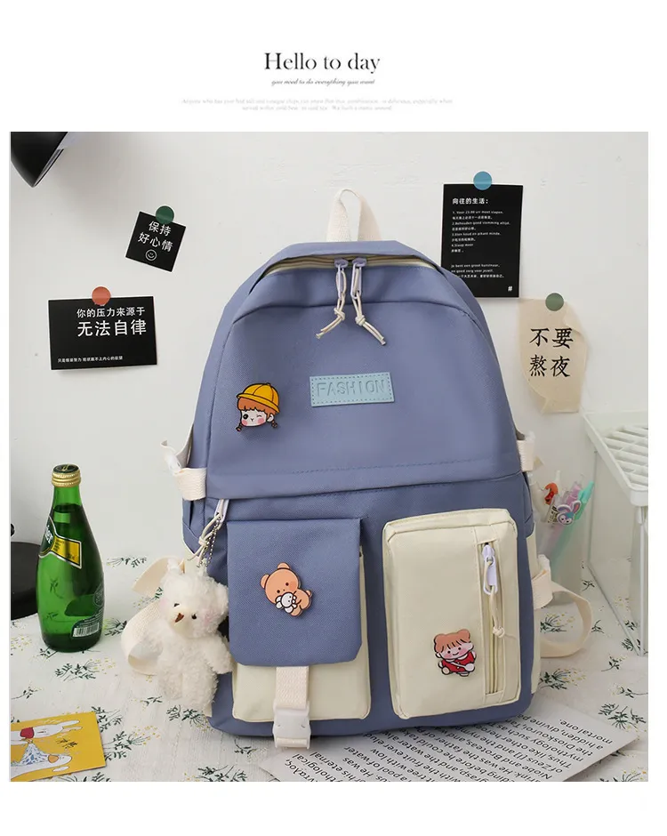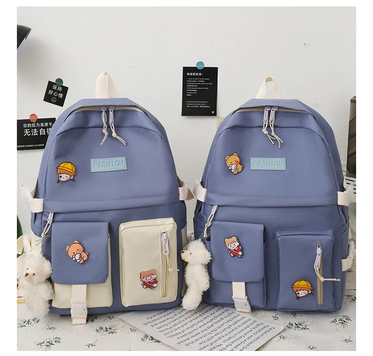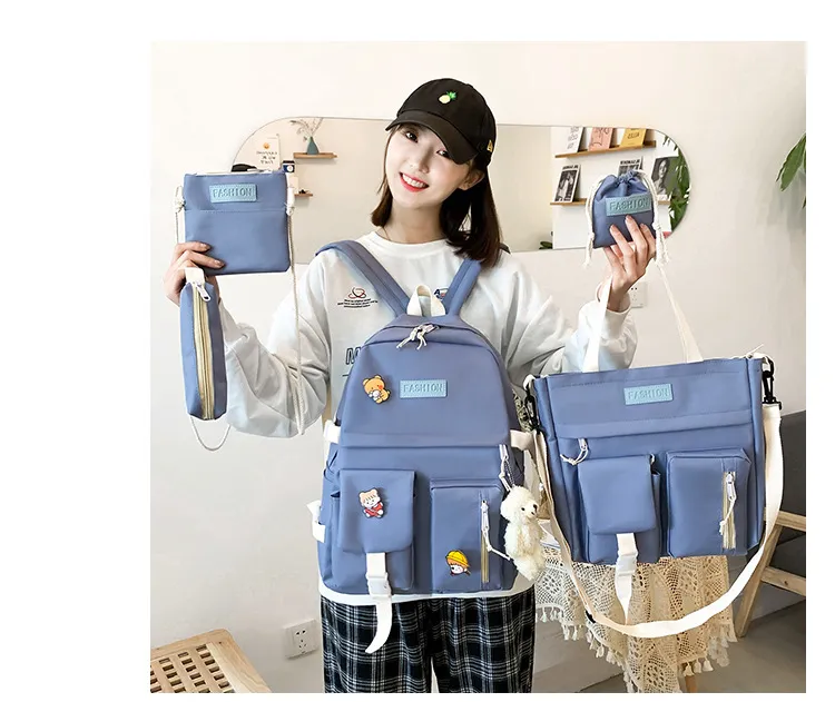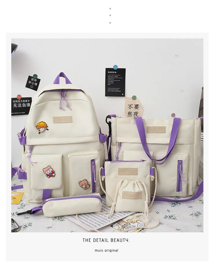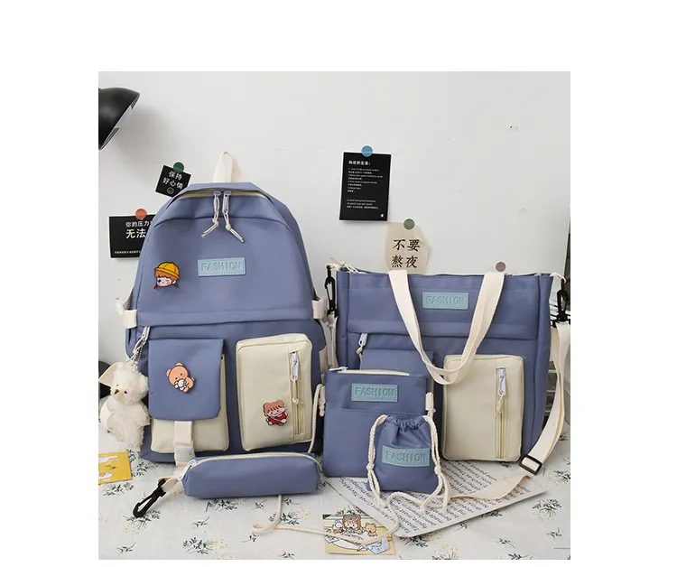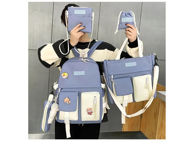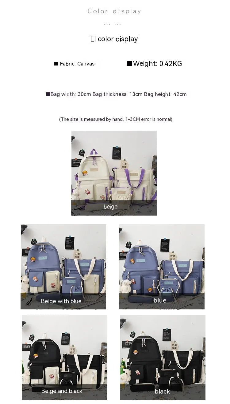 The College Students' Five-Piece Contrast Color Canvas School Bag is a stylish and versatile backpack set designed to meet the needs of busy students. Made from durable canvas material and featuring a trendy contrast color design, this set includes everything a student needs for a well-organized and fashionable day at school or college. With multiple compartments, spacious interiors, and additional matching accessories, this backpack is both practical and chic.