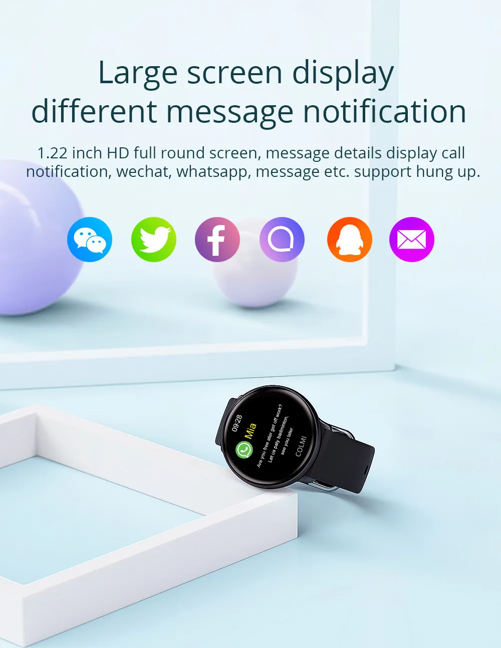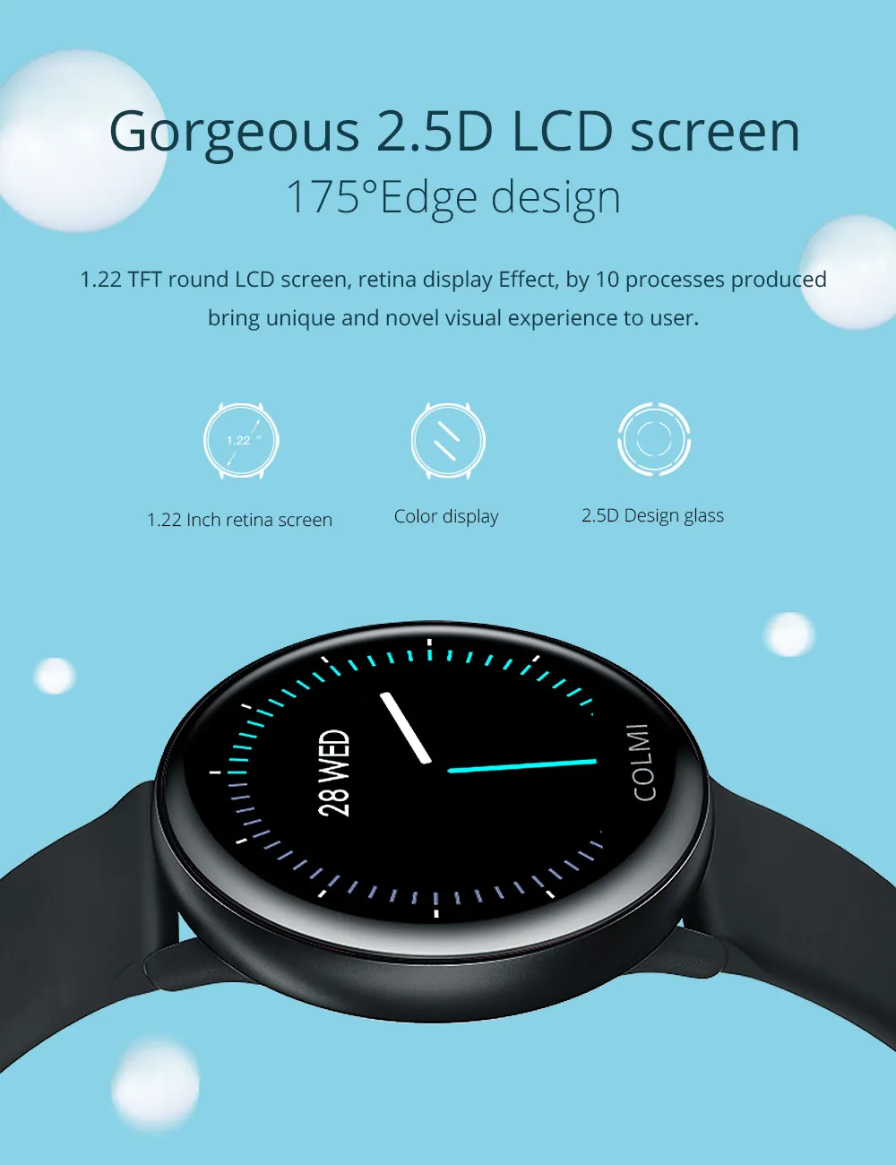 The COLMI SKY2 is equipped with a 1.22-inch color touchscreen display, providing clear visibility of notifications, health metrics, and fitness data. The responsive touch interface ensures easy navigation through various features and settings.