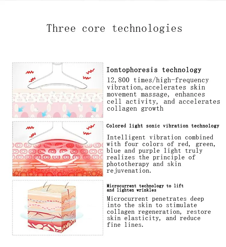 The Color Light Neck Beauty Instrument incorporates color light therapy, a highly effective method used to rejuvenate the skin. The device uses different wavelengths of light to penetrate the skin at varying depths, targeting specific skin issues such as dullness, fine lines, and uneven skin tone. Here’s how each light color benefits your skin:
