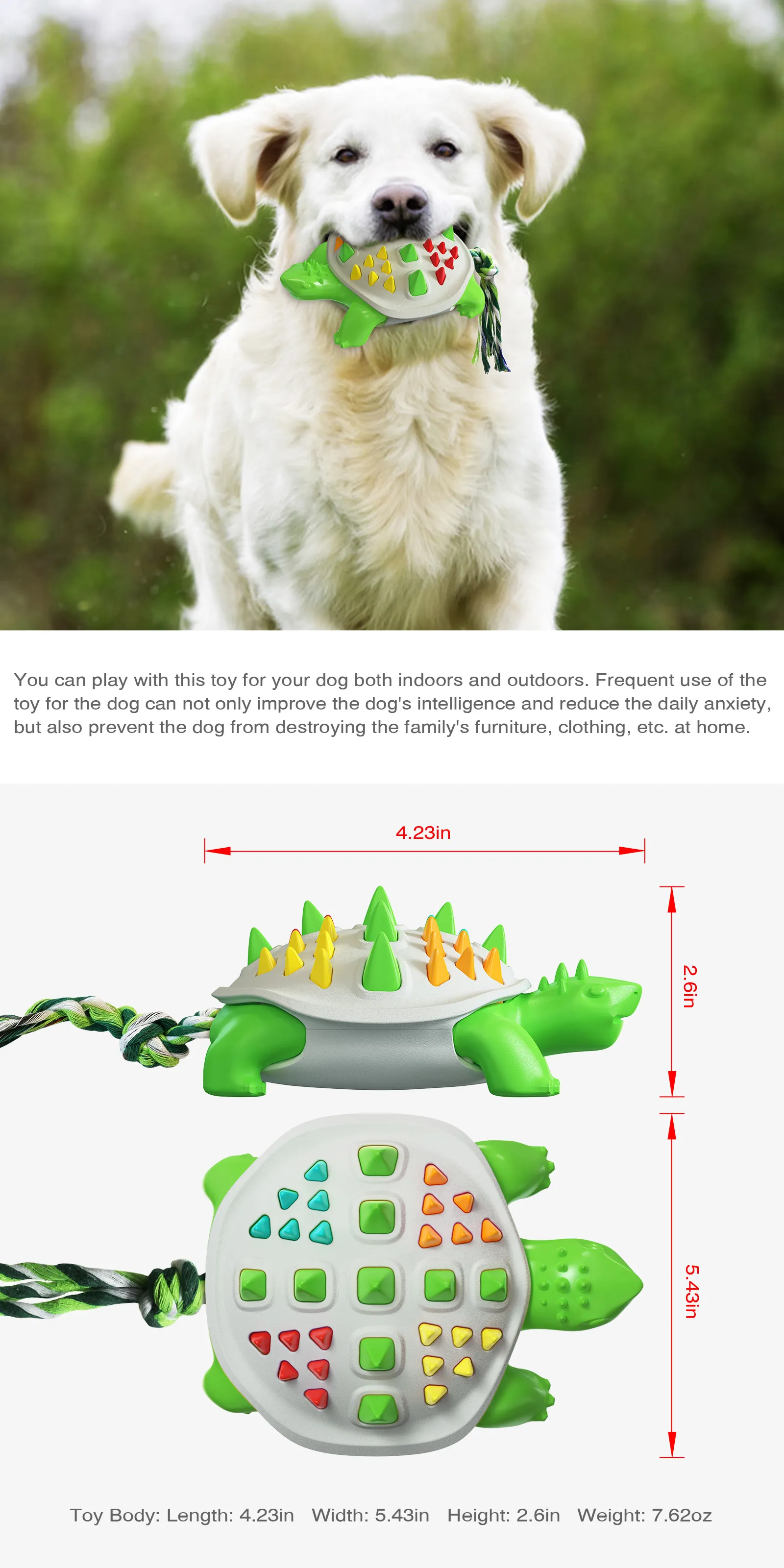 The colorful spikes on the tortoise’s shell are designed to help clean your dog’s teeth as they chew. The molar stick feature massages the gums, removes plaque and tartar, and helps maintain dental hygiene. Regular chewing helps to prevent gum disease and promotes healthy teeth, making this toy not only fun but also a great tool for maintaining your dog’s oral health.