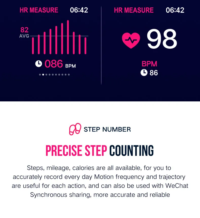 APP Health Measurements: Heart rate, blood oxygen, blood pressure, measurement. Heart rate monitoring throughout the day (displayed in bars,