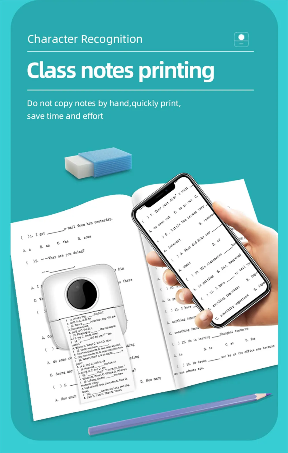The Convenient Mini Pocket Student Printer is a pocket-sized text thermal printer that offers an efficient, cost-effective, and portable printing solution. Ideal for students, teachers, professionals, and anyone in need of a compact printer, this innovative device lets you print notes, documents, labels, photos, and more with ease and speed. With its thermal printing technology, there's no need for messy ink cartridges or toners, making it both environmentally friendly and cost-efficient.